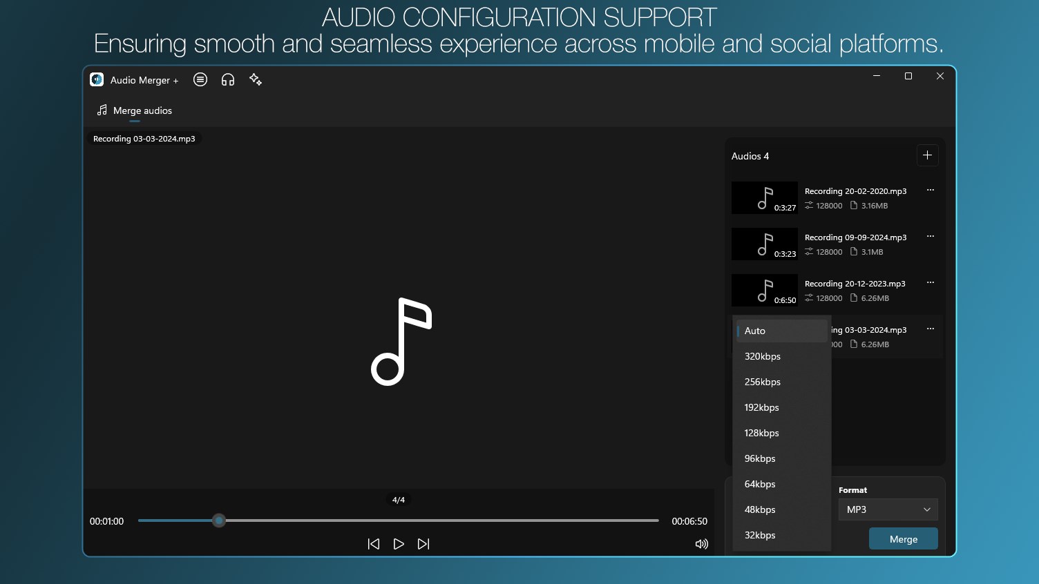 Combine multiple music and audio files into a single, seamless file with Audio Merger+. Our powerful app supports a wide range of audio formats, making it easy to merge music and audio files from different sources. Simply add your music and audio files, customize the order, and let our advanced technology do the rest.