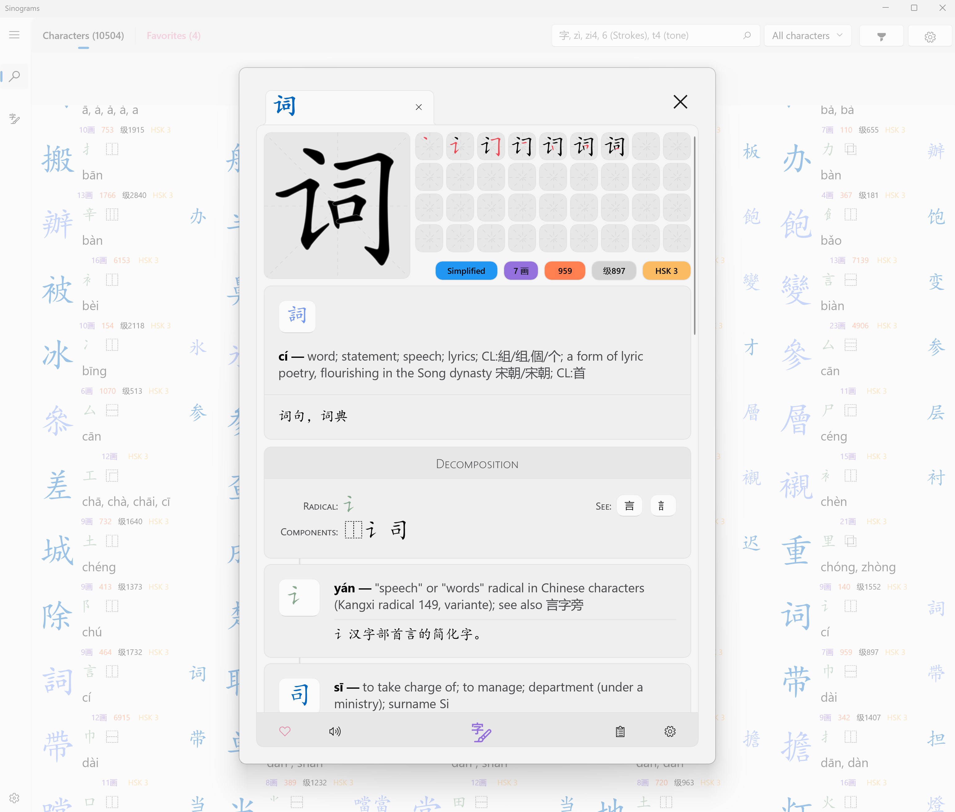 ● Detailed information for each character (pronunciation, translation, decomposition, etymology and usage examples)