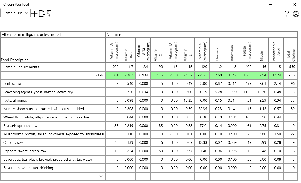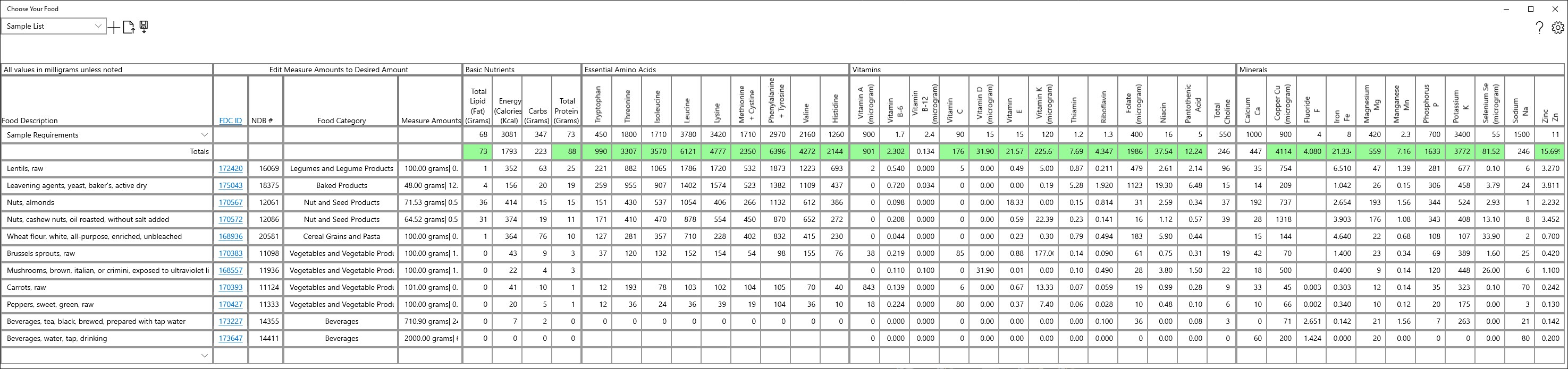 Nutrient Content of 7793 Foods from over 150 Years of Research by the U.S. Department of Agriculture (USDA), Agricultural Research Service.Filter, Search, and Sort for foods by Nutrient Content and Food Category.Organize food choices into Groups and Customize the amounts of each food item for recipes, meals, or the entire day.Click on the Food Data Central ID (FDC_ID) hyperlink to open your web browser to the official USDA website for that foodFood Choices are automatically saved so that your recipes and meals can grow as you use the app.Enter your own personal Nutritional Requirements and select foods to meet them.