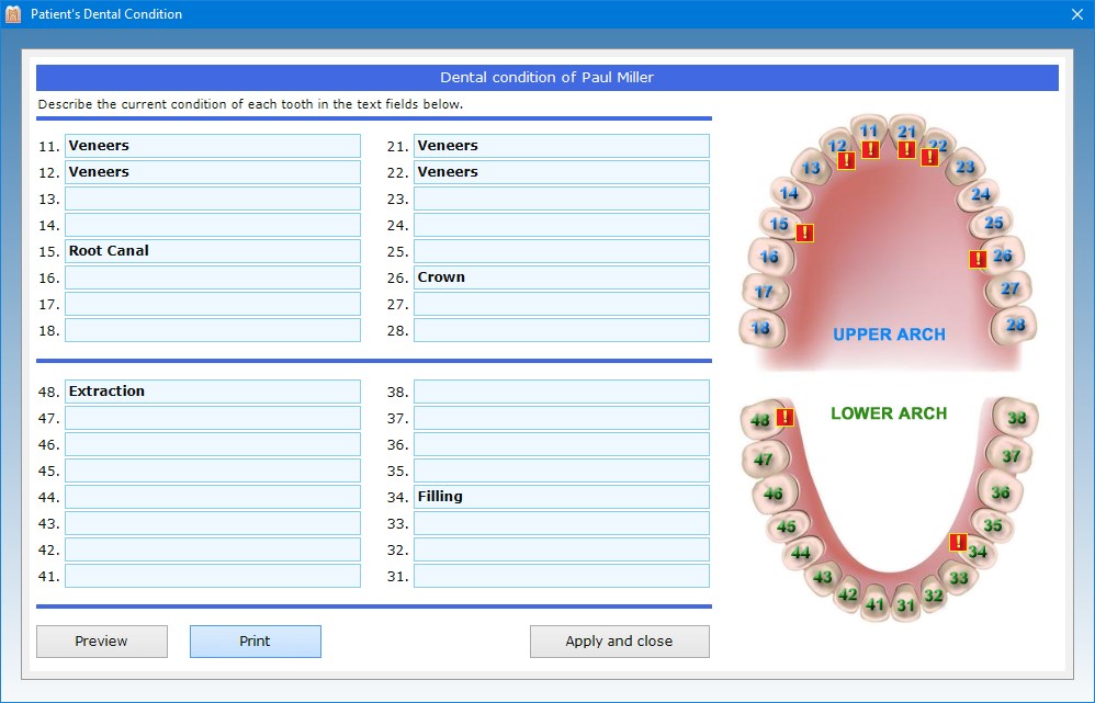By pressing the Dental Condition button, you access a section with text fields in which to describe the current state of each tooth (molars, premolars, canines, incisors) together with the graph of the upper and lower arch. When you fill in the text field relating to a tooth, a small square with an exclamation mark appears in correspondence with the image of the tooth concerned. In this way, the dentist can see at a glance which teeth have received treatment. The entire dental condition grid can be previewed or printed on paper.