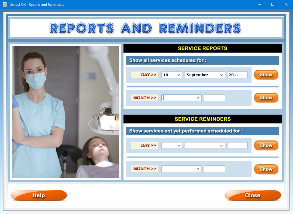 The Reports and Reminders app allows you to get daily and monthly reports and reminders on all the scheduled services of your dental office that have been stored in the annual databases. While a report considers all services of the selected day or month regardless of whether they have been completed or not, a reminder does not consider services that have been marked as performed by ticking the "Service performed" box.