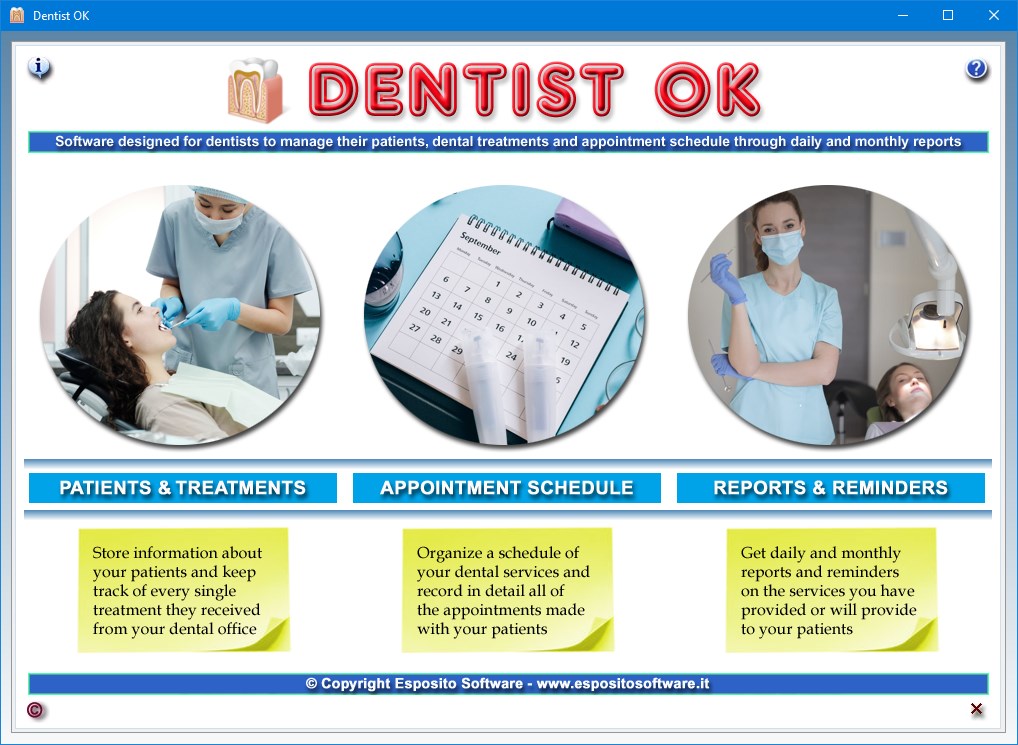Dentist OK is very user-friendly software designed to manage the patients of a dental office by storing their personal data and contact details, dental therapies and the services performed on each individual tooth. A folder can be attached to each patient's record in which to insert photos of dental radiographs or any other document. This app not only allows you to keep under control the services provided to your patients, but it also makes it possible for you to get reports on the amounts paid by each of them since they started getting served by your dental office. Dentist OK is composed of three interacting apps that allow you to keep track of your patients' information and dental treatment history, plan your services by managing a schedule of your appointments with your patients and get daily and monthly reports on all of the services perfomed and amounts received.