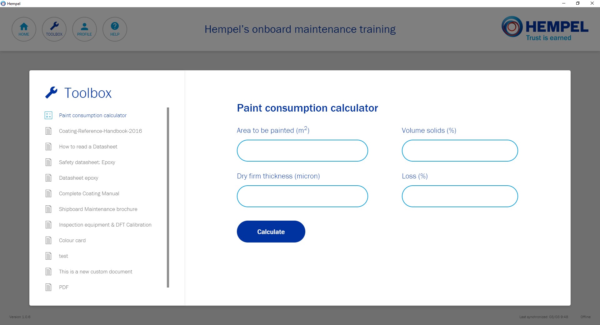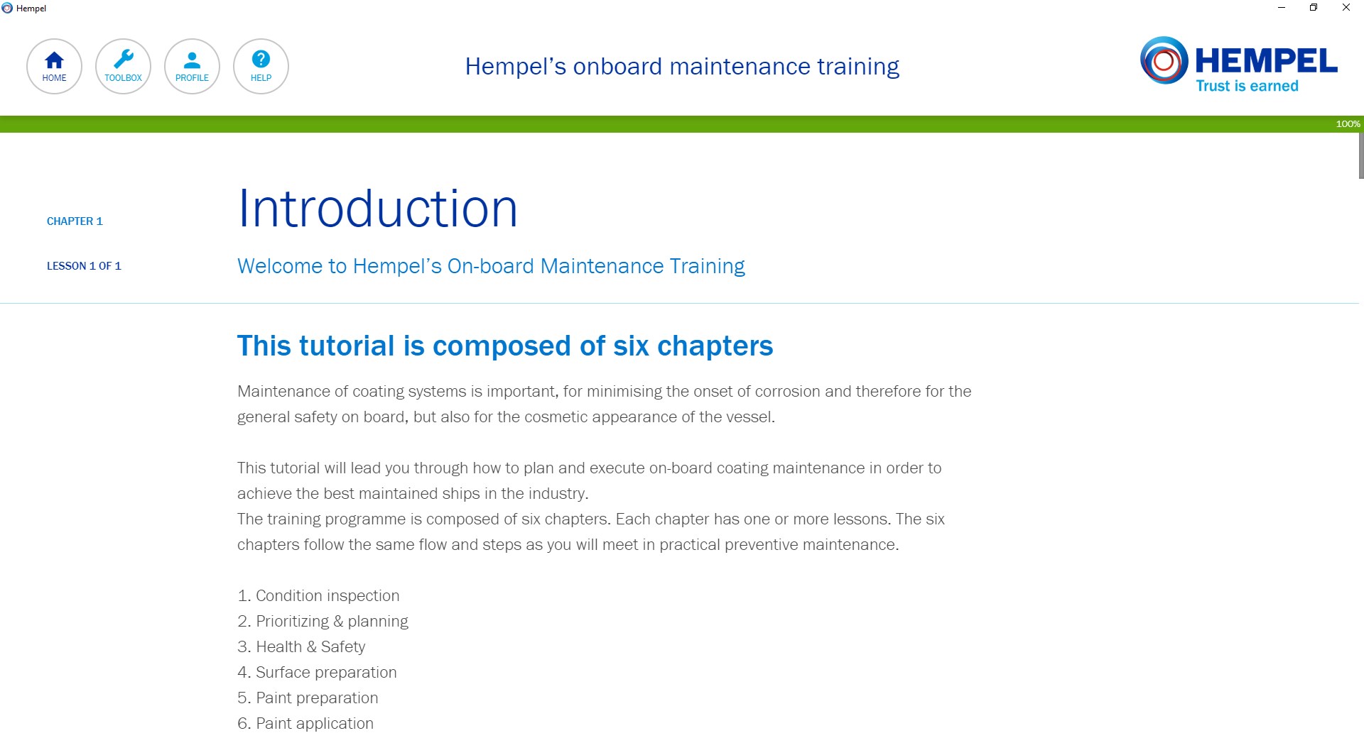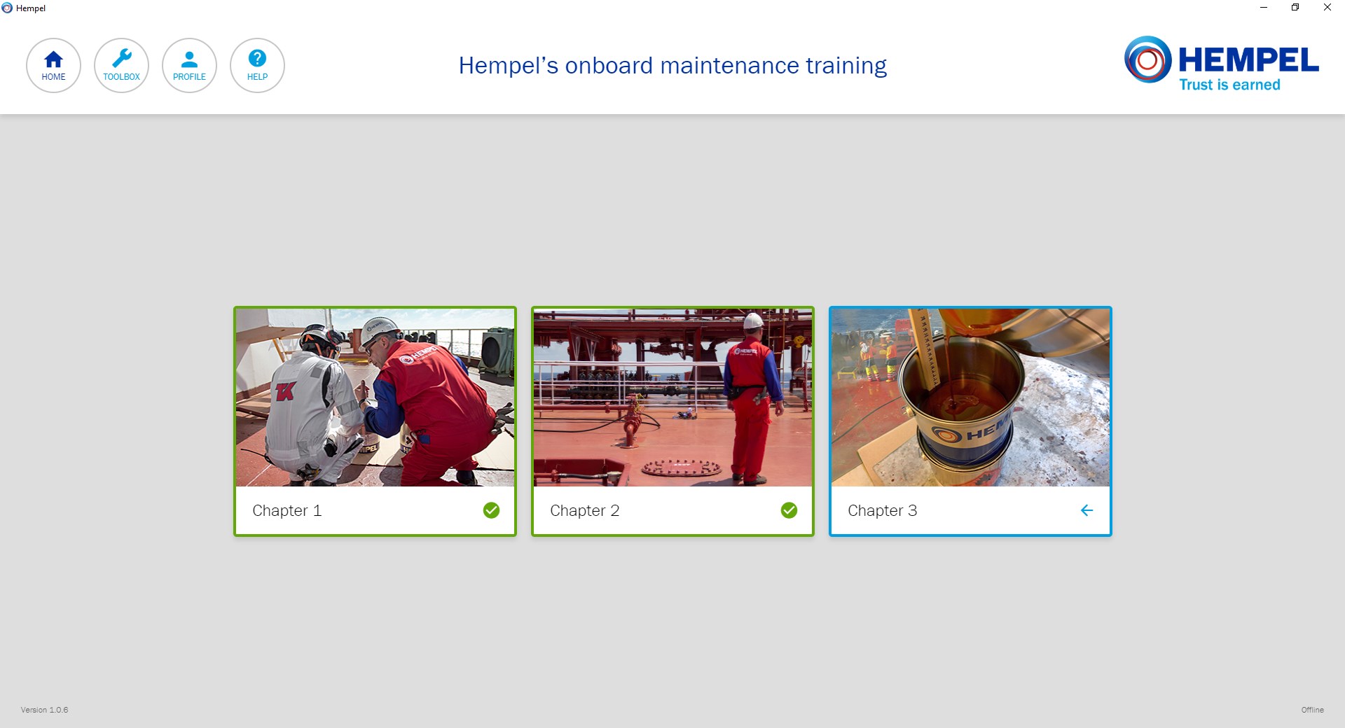 By means of visual media, thorough descriptions, exercises and quizzes this Hempel tutorial app gives the user the opportunity to become certified in on-board painting maintenance.