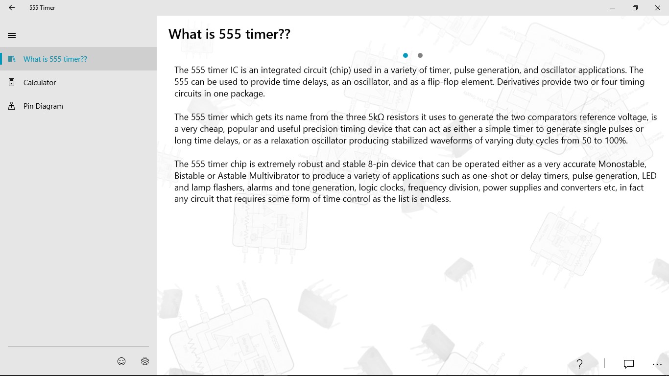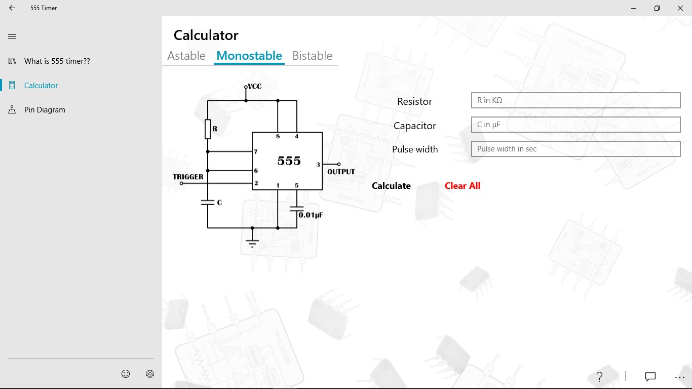 555 timer is a very essential IC used in electronics. It has many application in almost every industry and every electronic equipment we use daily. With the help of this app learn how to use 555 timer and implement in your circuit. This app provides calculation in monostable and astable mode. In astable mode any two parameter can be calculated by providing remaining parameters and any one parameter can be calculated in monostable mode. This help in understanding how the frequency and duty cycle of square wave depends upon the capacitor and frequency in astable mode and also helps in understanding how the pulse width depends upon resistor and capacitor in monostable mode.