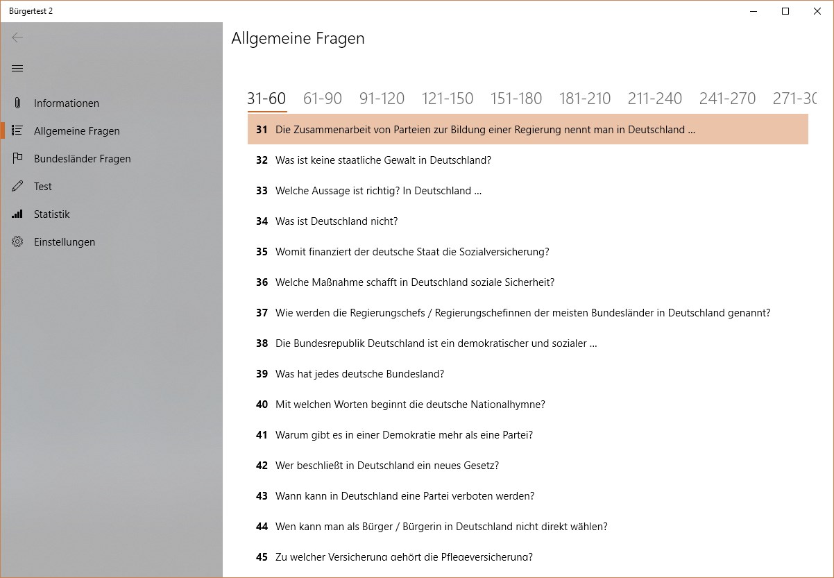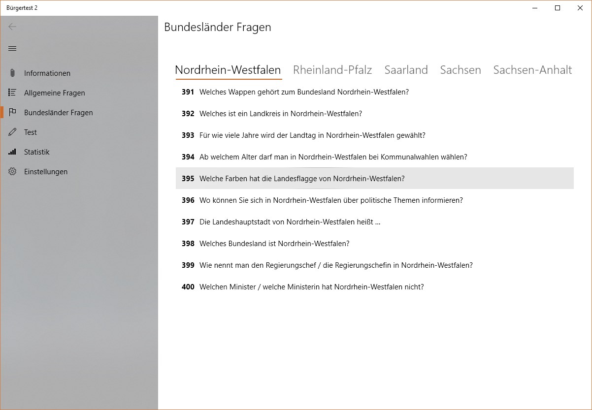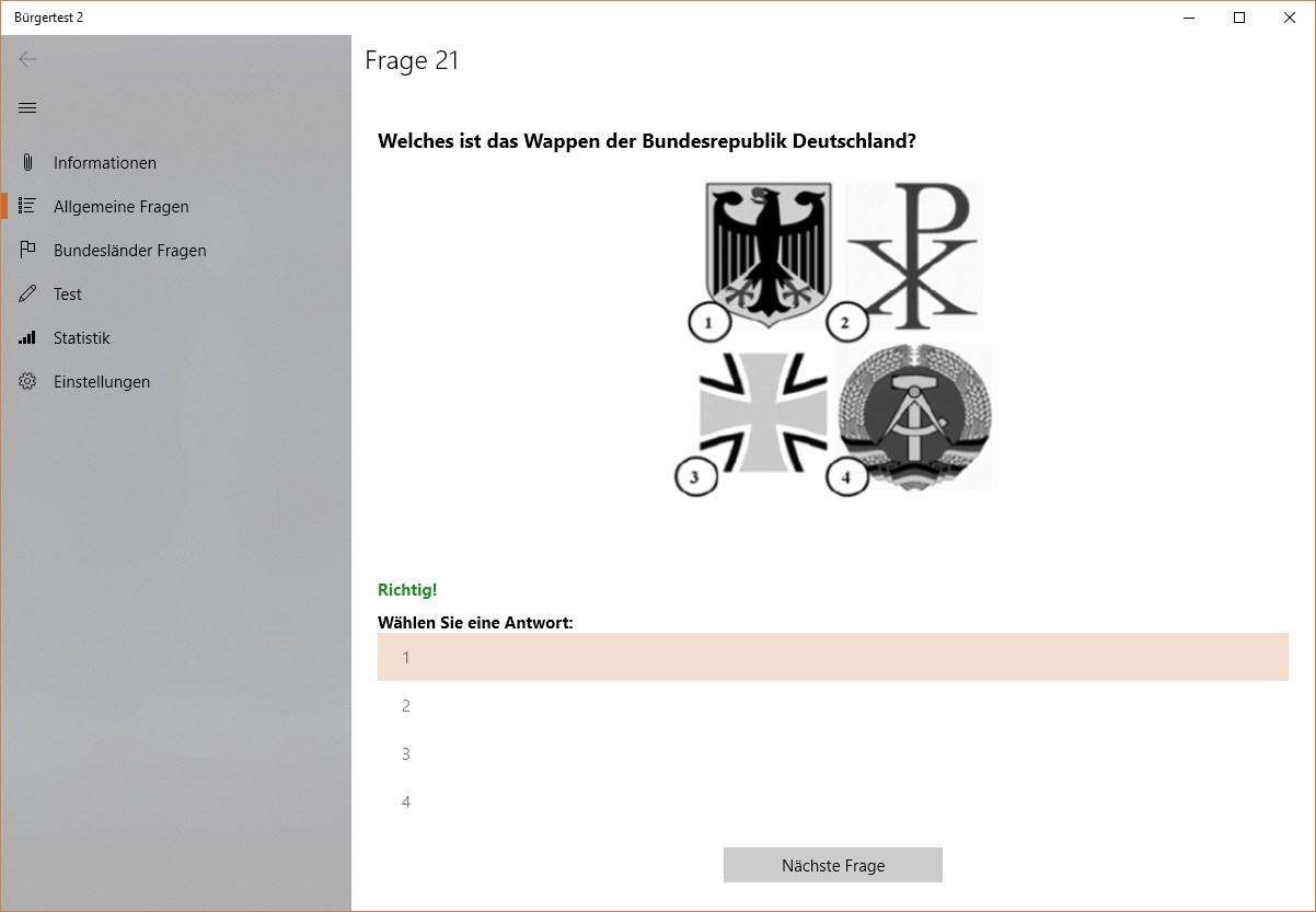 Testen Sie Ihre Kenntnisse der Rechts- und Gesellschaftsordnung und der Lebensverhältnisse in Deutschland oder bereiten Sie sich für den Einbürgerungstest vor. Die Anwendung enthält alle 300 original Fragen sowie alle spezifischen Fragen zu den einzelnen Bundesländern aus dem offiziellen Fragenkatalog. Bereiten Sie sich auf den Test vor, indem Sie die Fragen einzeln abarbeiten oder indem Sie zufällig gestellte Tests lösen.