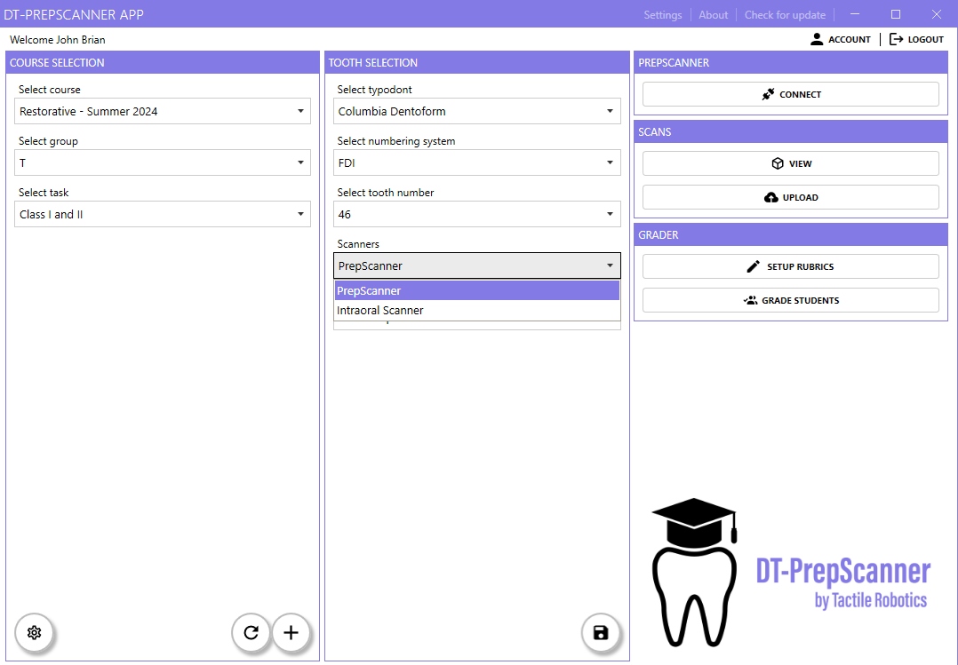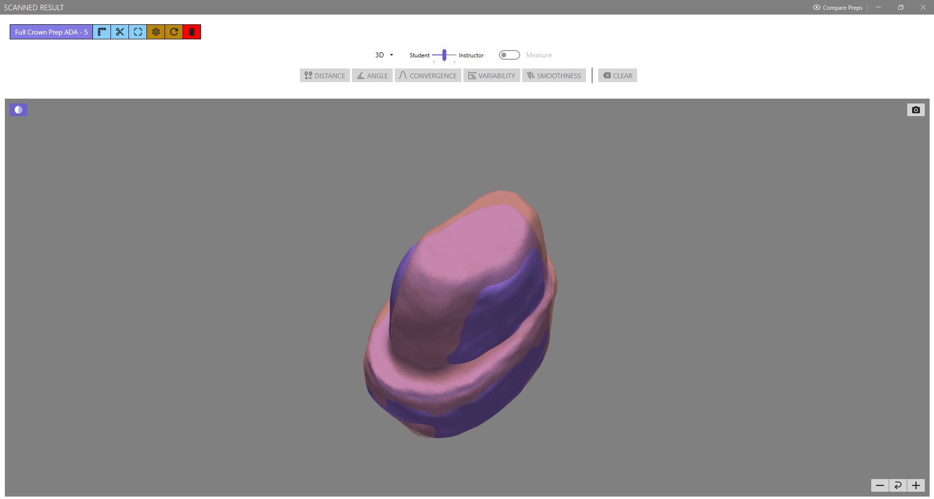 In dental schools, it is essential to ensure that students' dental preps are graded based on a standard ground and accurately. DT-PrepScanner is an automated measuring device that provides fast, precise, and objective tooth prep grading. Students can use the scanner machine to scan a single or multiple tooth prep(s) and submit the results through the App. The instructor uses simultaneous tooth prep scanning (faster than the manual method) using an automatic laser scan to ensure accurate and standardized measurements and grading. A library of standard and customizable rubrics allows the students to access invaluable cloud-based information anytime, anywhere (in the lab or at home). Dental students can self-assess themselves before submitting their final work to their instructor and have access to the instructor's prep via the virtual tutor feature and digital rubrics. The students can also compare the instructor's prep vs. student's prep - intact prep vs. student's prep.