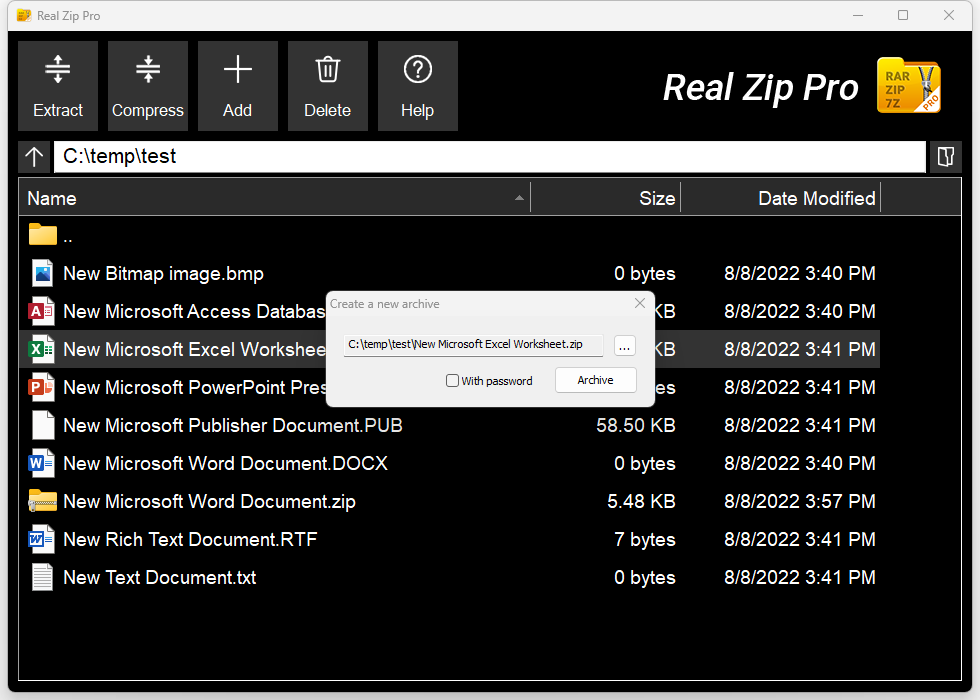 Note: the file compression feature of this app can only create new Zip format files but no other formats.