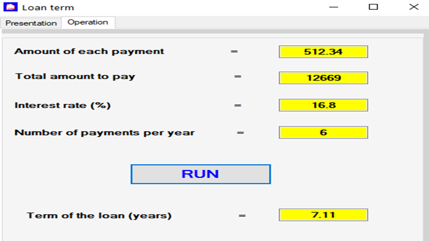 This application is intended to calculate the duration necessary to pay back a loan. We must indicate the loan amount, the amount of each regular payment, the annual number of payments and the interest rate.