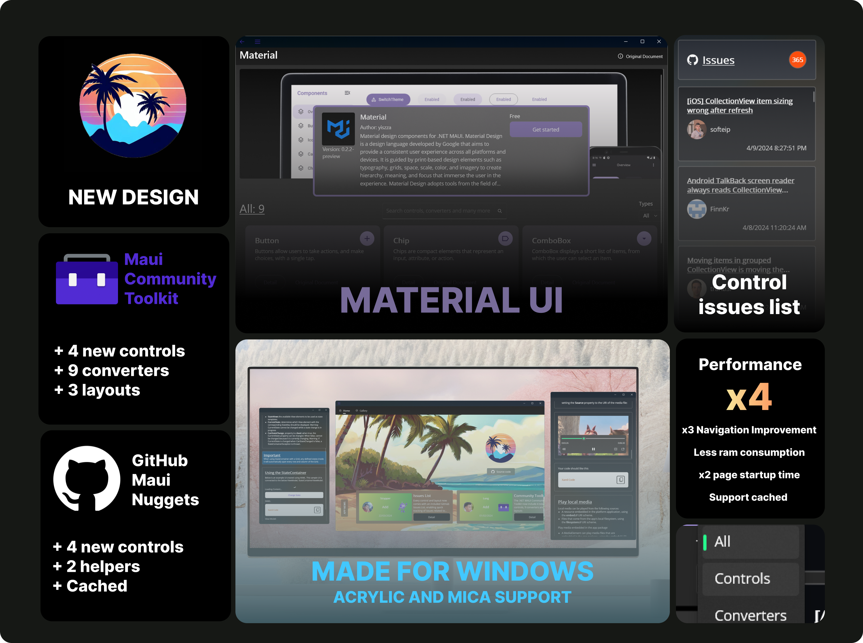 4. GitHub Community Gallery: We\'ve integrated six widely used GitHub nuggets that are commonly utilized with .NET MAUI, including LiveChart2, ZXing.Net.Maui, and more. This gallery not only provides access to these resources but also offers UI fixes to address issues like stretched clicking and hovering targets for a smoother user interaction.