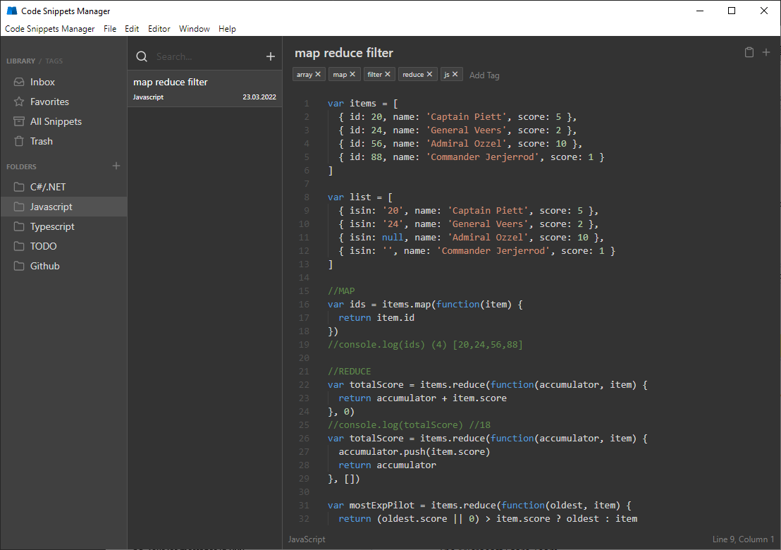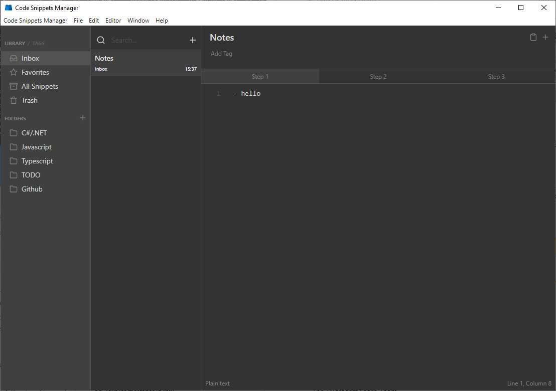 Code snippets manager allows you to organize snippets using multi-level folders as well as tags. Each snippet has fragments - tabs, which gives even greater level of organization.assistant lives in the tray and gives you the ability to always have quick access to your snippets using the search. The snippet you selected will be copied to the clipboard.You can use any service that provides cloud synchronization, such as iCloud Drive, Google Drive, Dropbox or other similarCode snippets manager allows you to write in Markdown and also provide syntax highlighting inside a code block. And of course there is a preview.