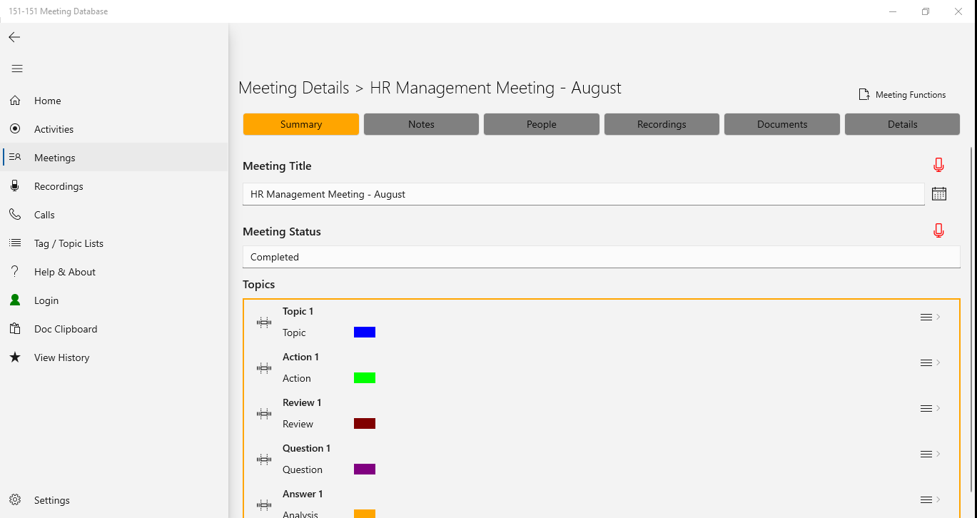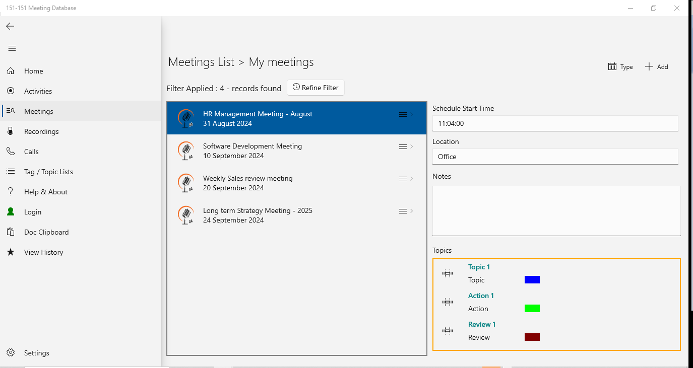 The 151-151 Meeting Database system will make it easier and more efficient for you to create 100% accurate records of what was said and agreed during important meetings and conversations. It will save you time writing notes, improve efficiency and reduce misunderstandings, arguments and disputes.