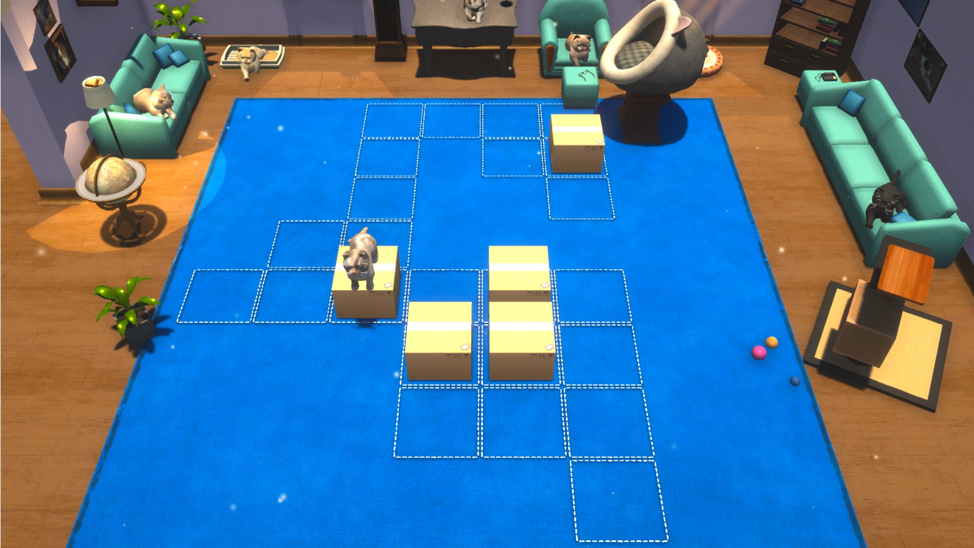 In "Mimi the Cat: New Friends," you'll embark on a charming journey with Mimi, a delightful cat who loves puzzles and making new friends. Your mission is to help Mimi navigate through a variety of fun and challenging levels, moving, climbing, and stacking boxes to find her way to new friends and cozy spots.