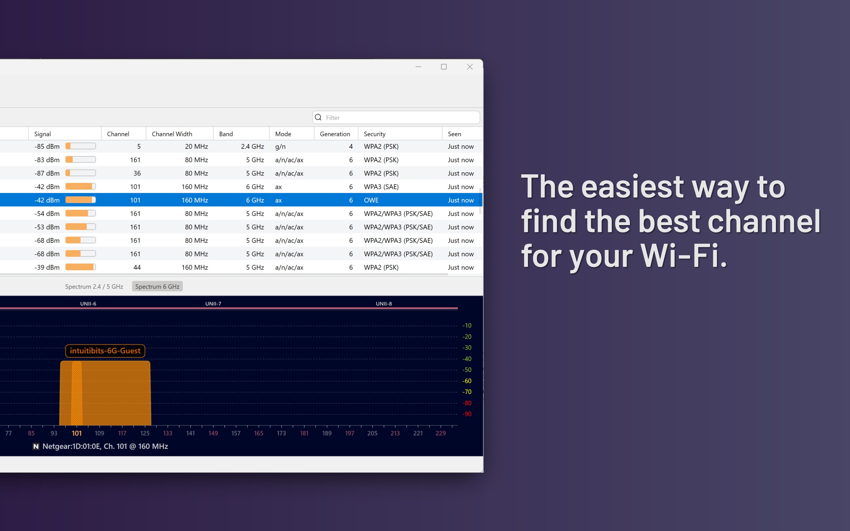 Easy-to-use, intuitive user interfaceGraphical visualization of the Wi-Fi environmentSupports 2.4 GHz, 5 GHz, and 6 GHz frequency bands as well as 20, 40, 80, 160, and 320 MHz channelsSupports Wi-Fi 4, Wi-Fi 5, Wi-Fi 6, Wi-Fi 6E, and Wi-Fi 7Works with 802.11a/b/g/n/ac/ax/be networksAccurate and configurable conversion of signal strength measurements from dBm to percentage (%)Selectable and sortable columns Quick filtering