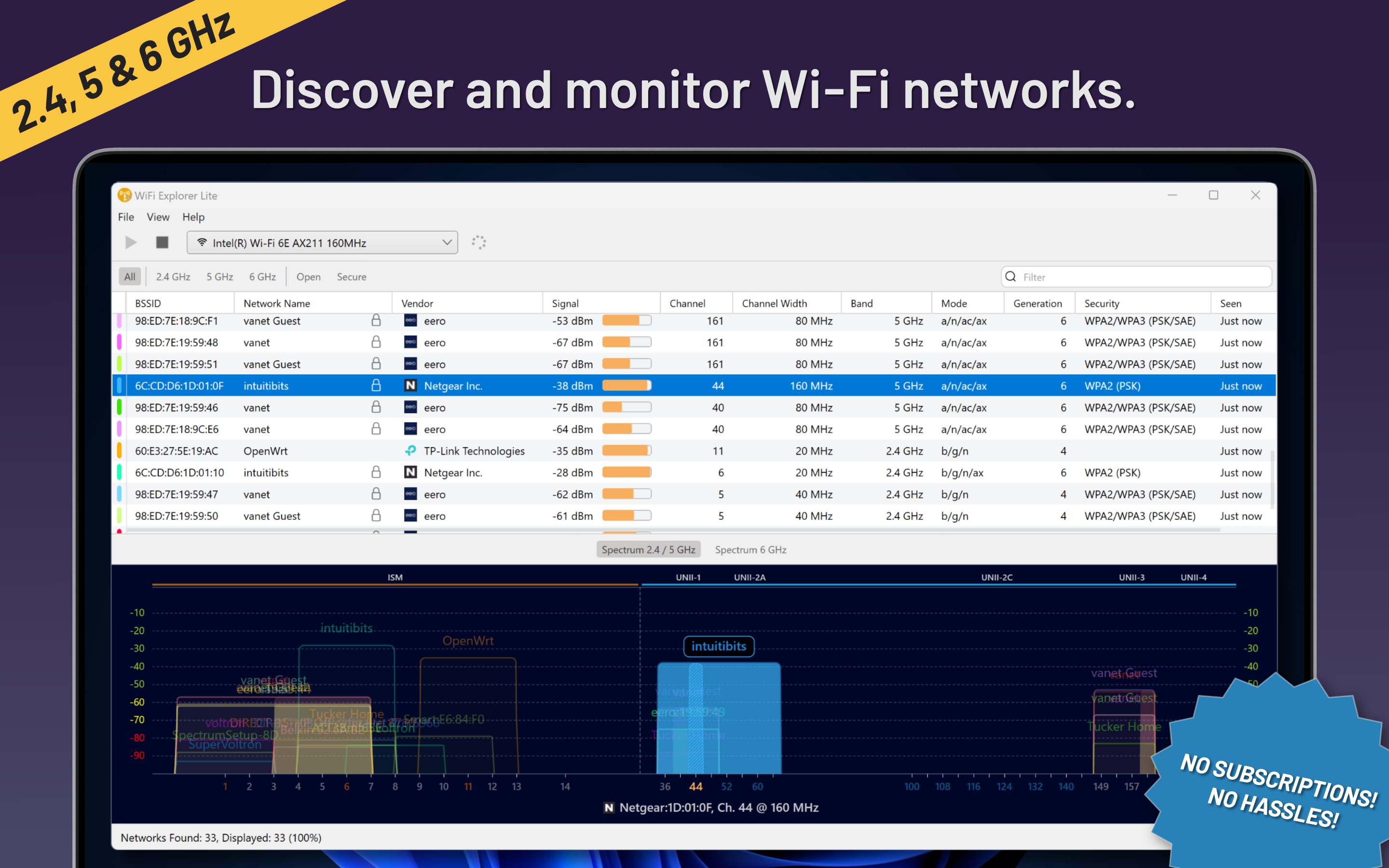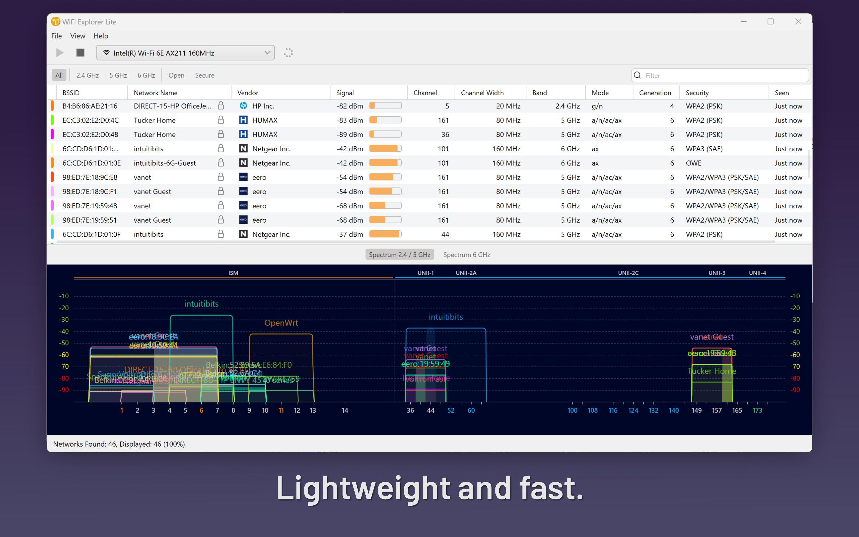 WiFi Explorer Lite is a wireless network discovery tool that can help you identify channel conflicts and configuration problems affecting your home or office Wi-Fi network's connectivity or performance.