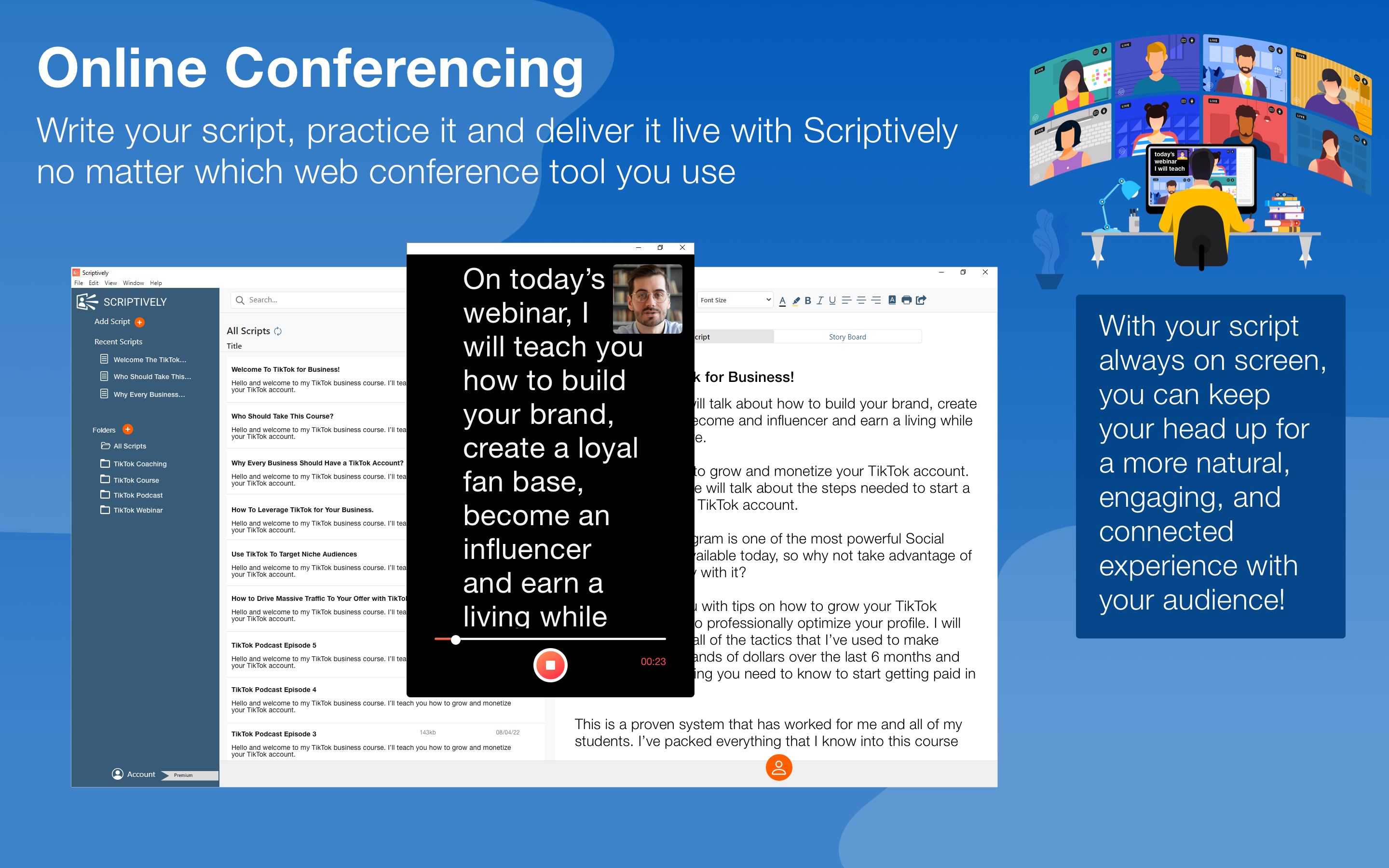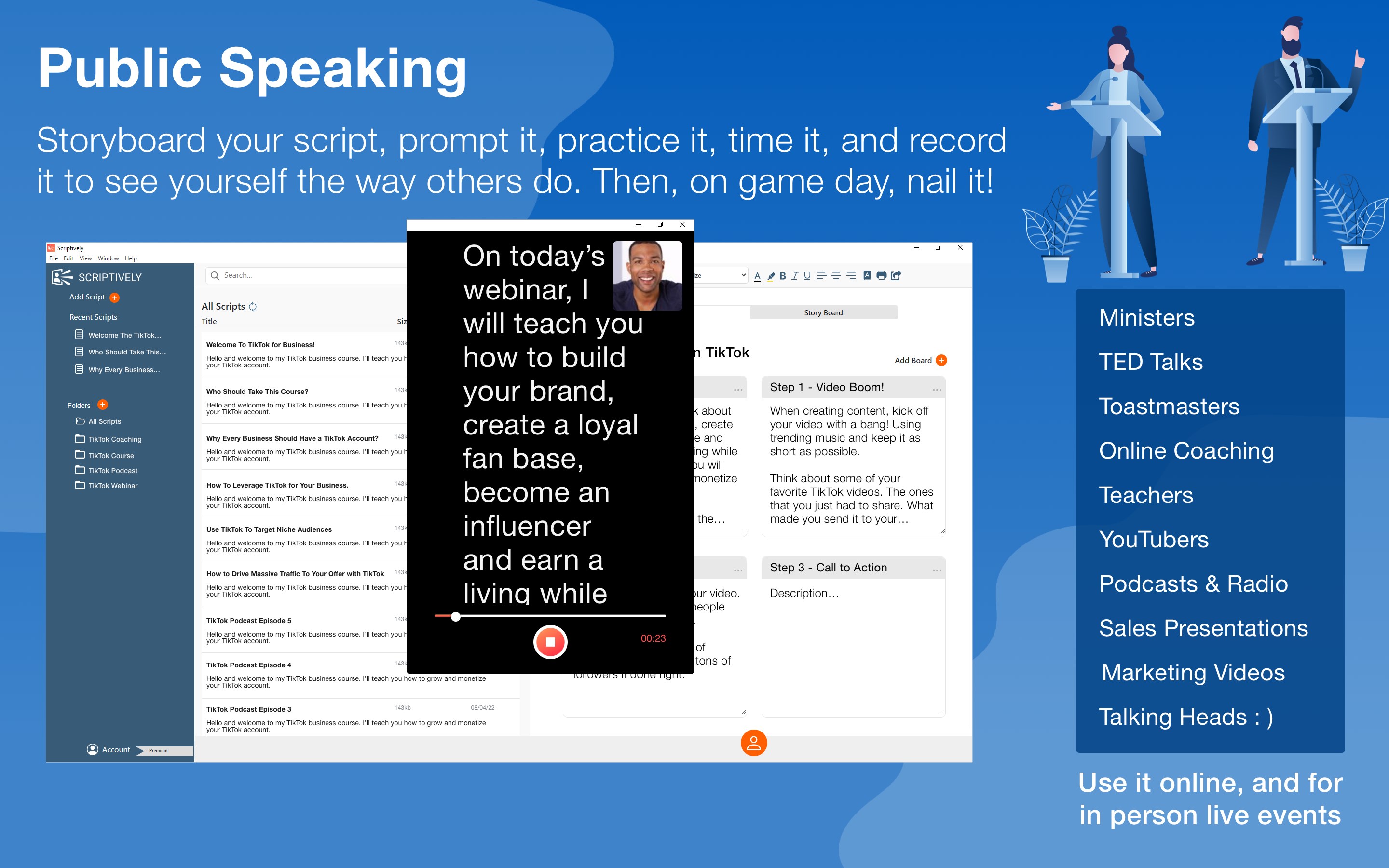 Scriptively is an all-in-one script editor, teleprompter with speech recognition, and audio & video recorder that provides speakers with everything they need to write and deliver great talks and presentations!