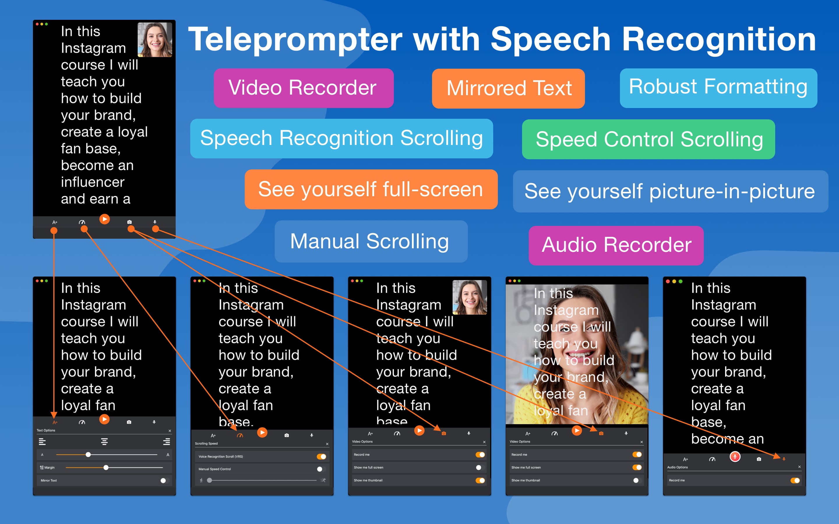 TeleprompterScriptwriterStoryboard EditorSpeech Recognition Teleprompter ScrollingVoice RecorderAudio RecorderFolder and Script ManagementCloud Storage and BackupSync between Windows, Mac, Android, and iOS Devices