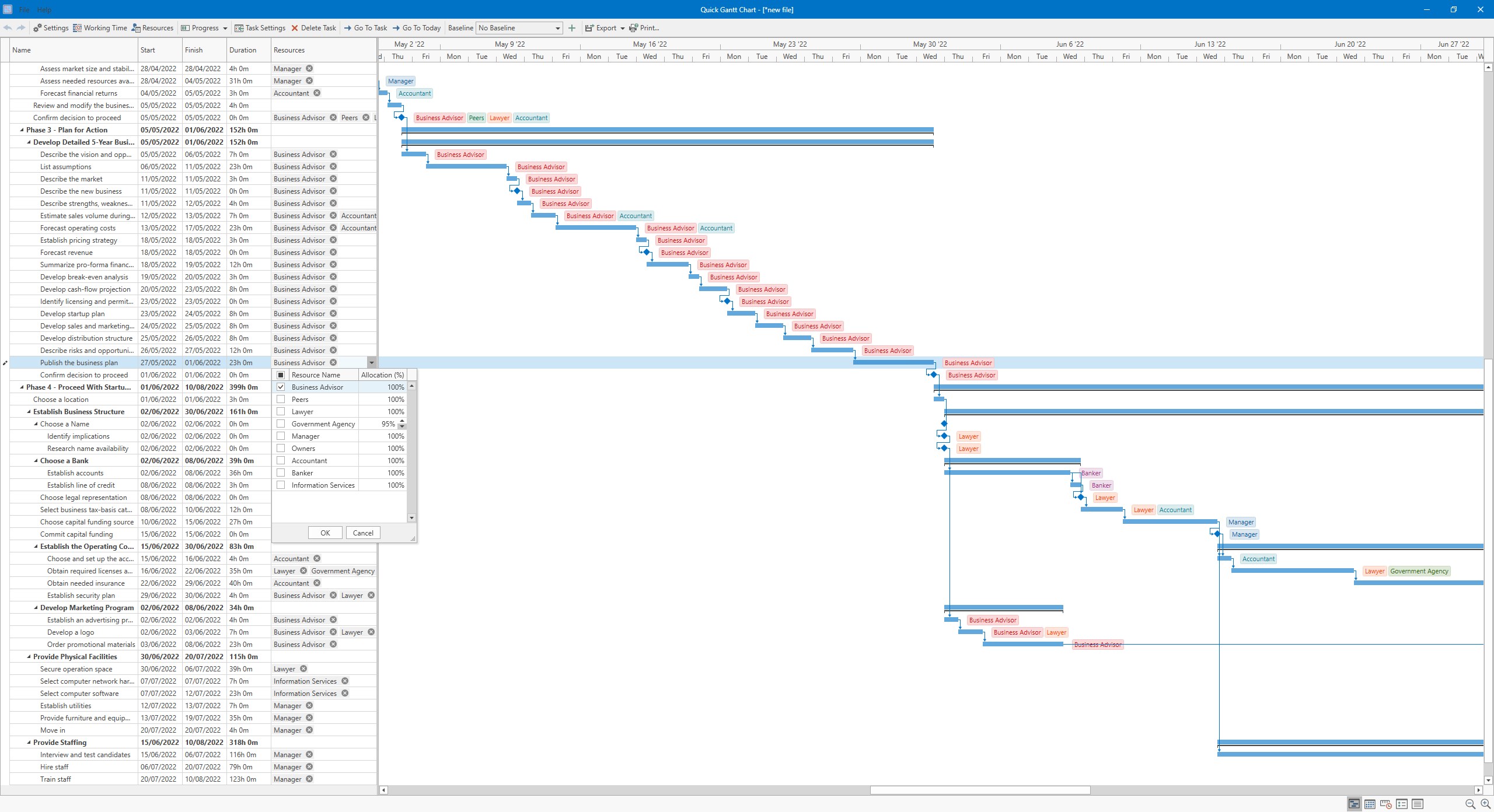 You can assign resources to tasks. Resources can be people responsible for tasks, equipment, and materials. You can also specify the percentage of time a resource spends on a task and check for potential conflicts.