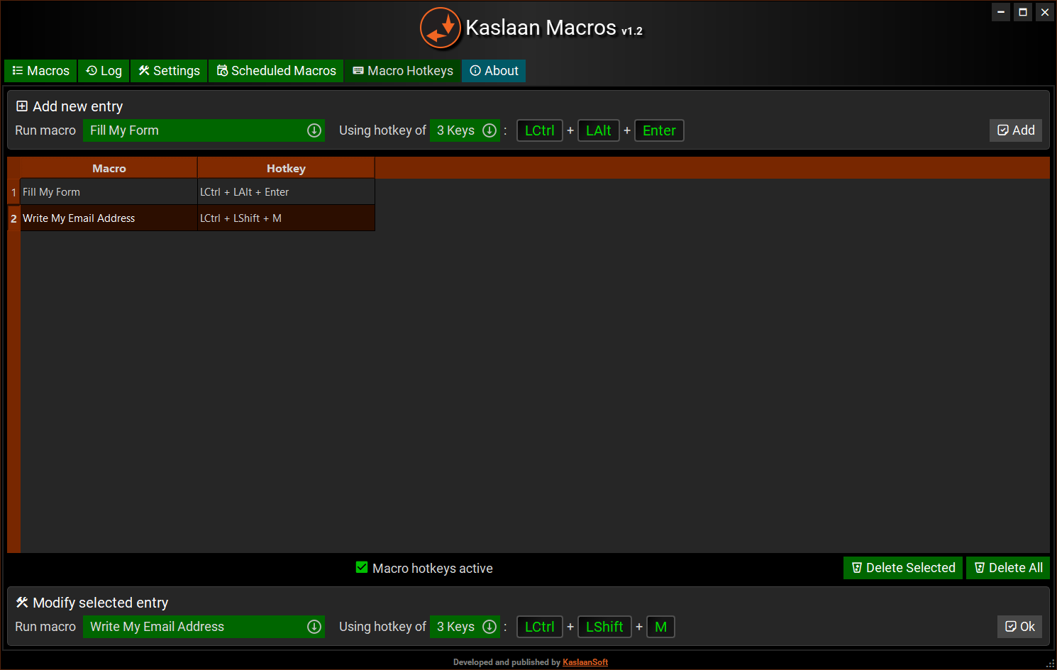 THIS IS FREE TRIAL VERSION OF KASLAAN MACROS. USERS CAN KEEP MAX 2 MACROS ONLY, AT THE SAME TIME. ALSO, CANNOT SCHEDULE OR ASSIGN KEYBOARD HOTKEY TO MORE THAN 2 MACROS. TRIAL VERSION CAN RUN MAX 15 TIMES. IT MUST BE PURCHASED FOR UNLIMITED USAGE.