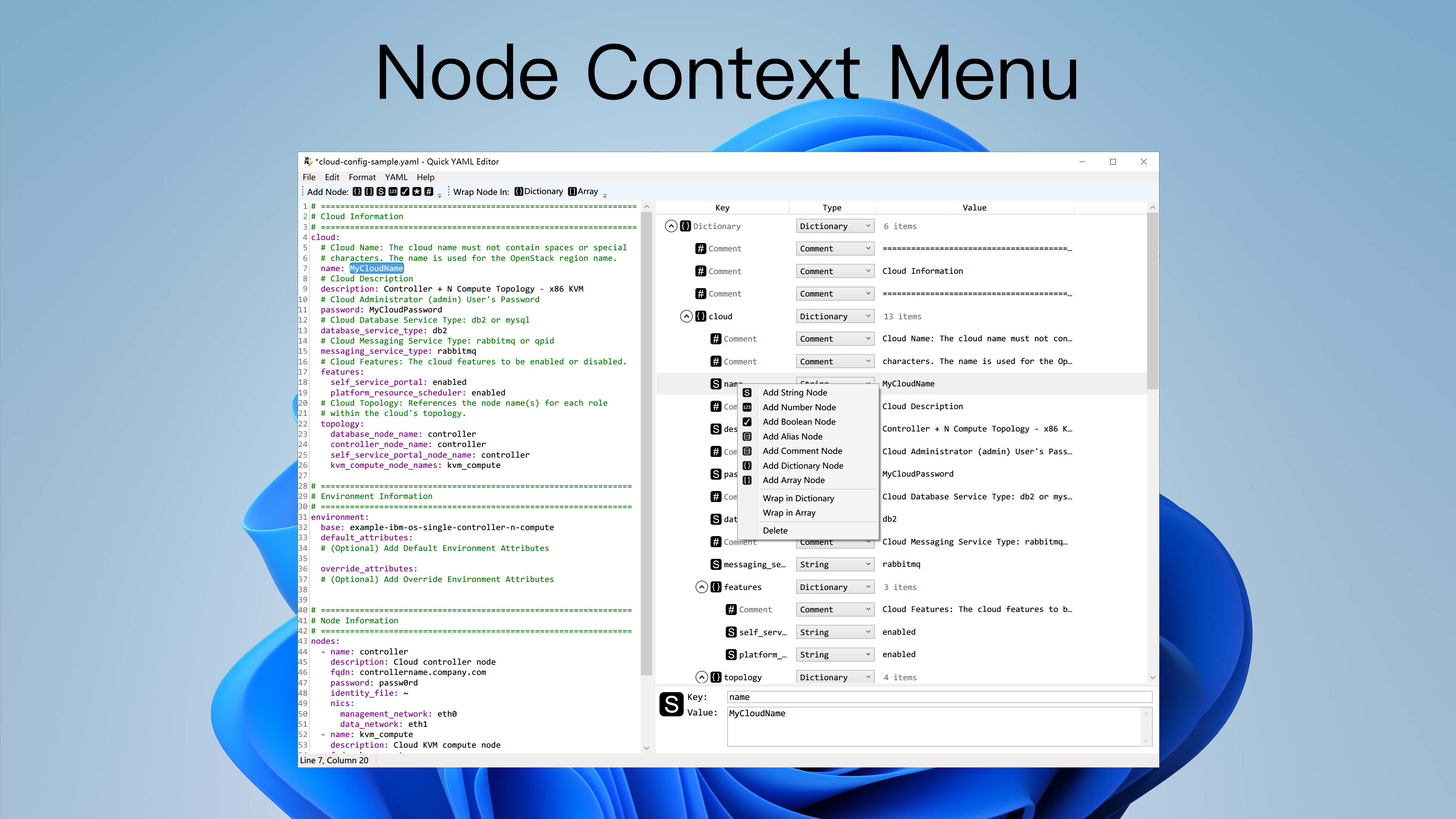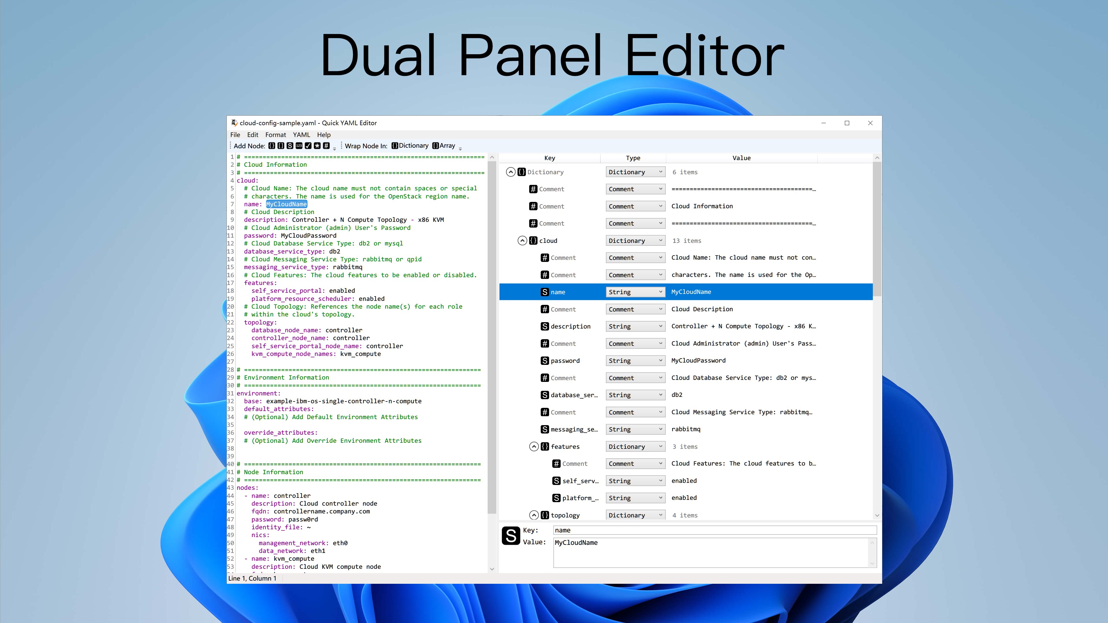 Quick YAML Editor is a powerful YAML editor for Windows. It comes with a Visual Tree View of the YAML structure and can promptly check YAML formatting issues, also it can convert from and to PLIST, JSON formats files.