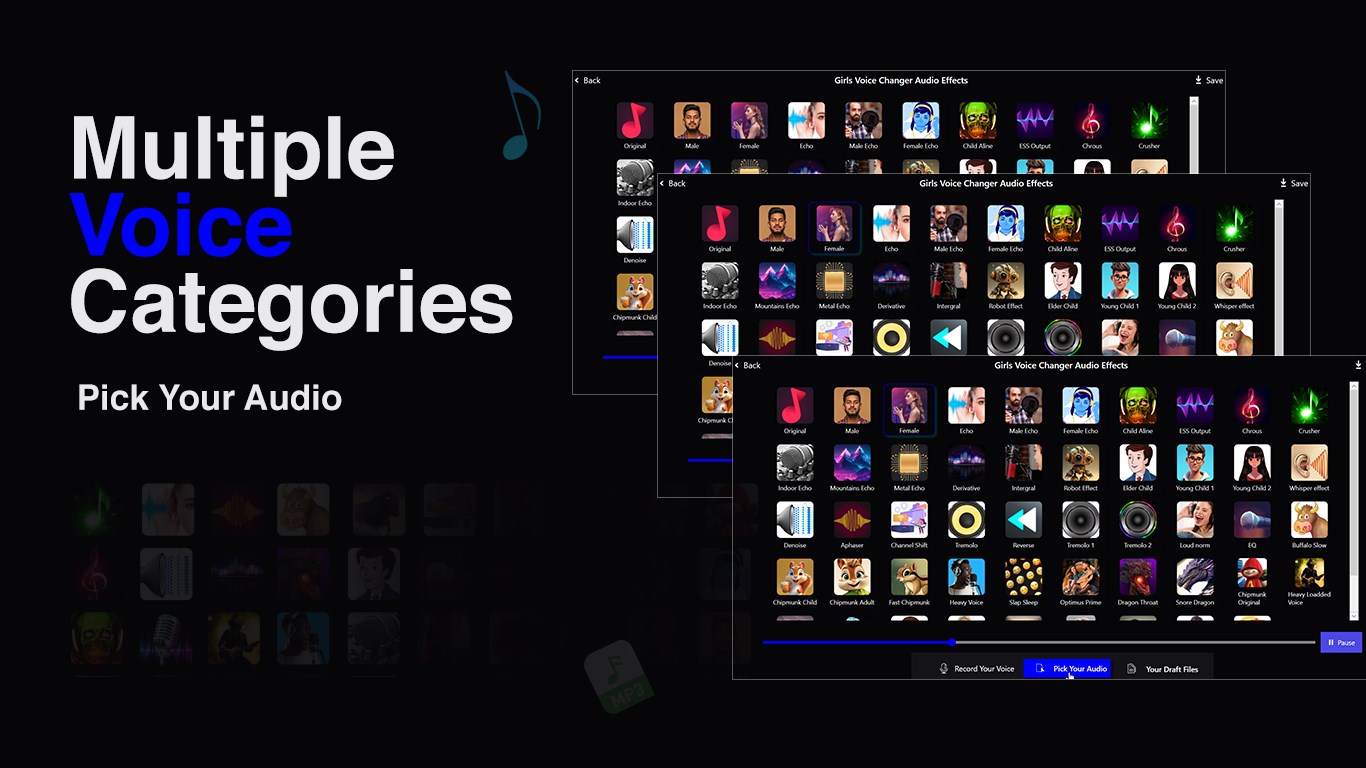 If you wish to modify your voice into different avatars such as a female voice, a male voice, a baby voice, or other variations, or if you're in search of a fun voice changer app to generate fake voices for pranks, or even to add voice effects and audio effects to dub videos, then this voice changer app is the ideal solution for you. It empowers you to playfully and creatively alter your voice, allowing you to have a great time enhancing your audio content. Have fun experimenting with various voice styles and unleash your creativity with this versatile voice changer app!