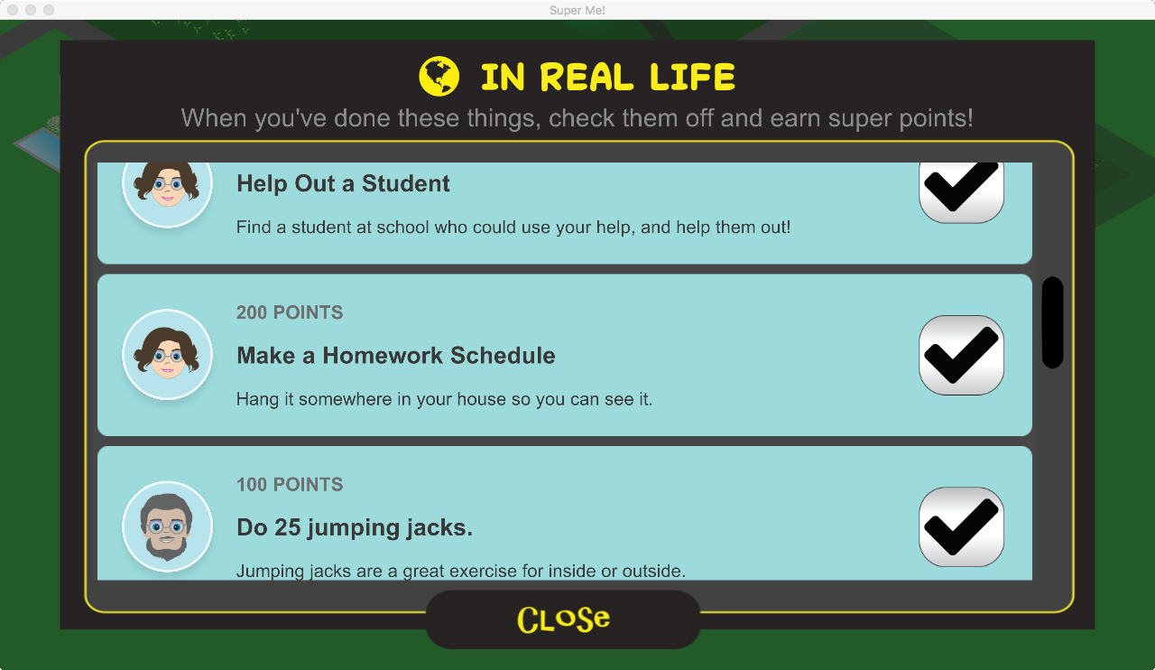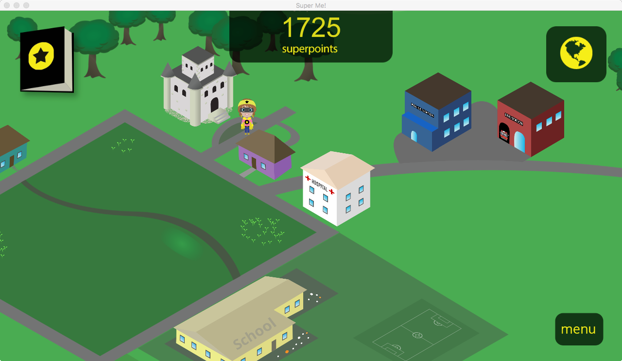 Throughout the app, players interact with other characters in the community, test their knowledge, complete fun activities, and take on real life activities. Along the way players earn super hero accessories until they finally become their true Super Me!