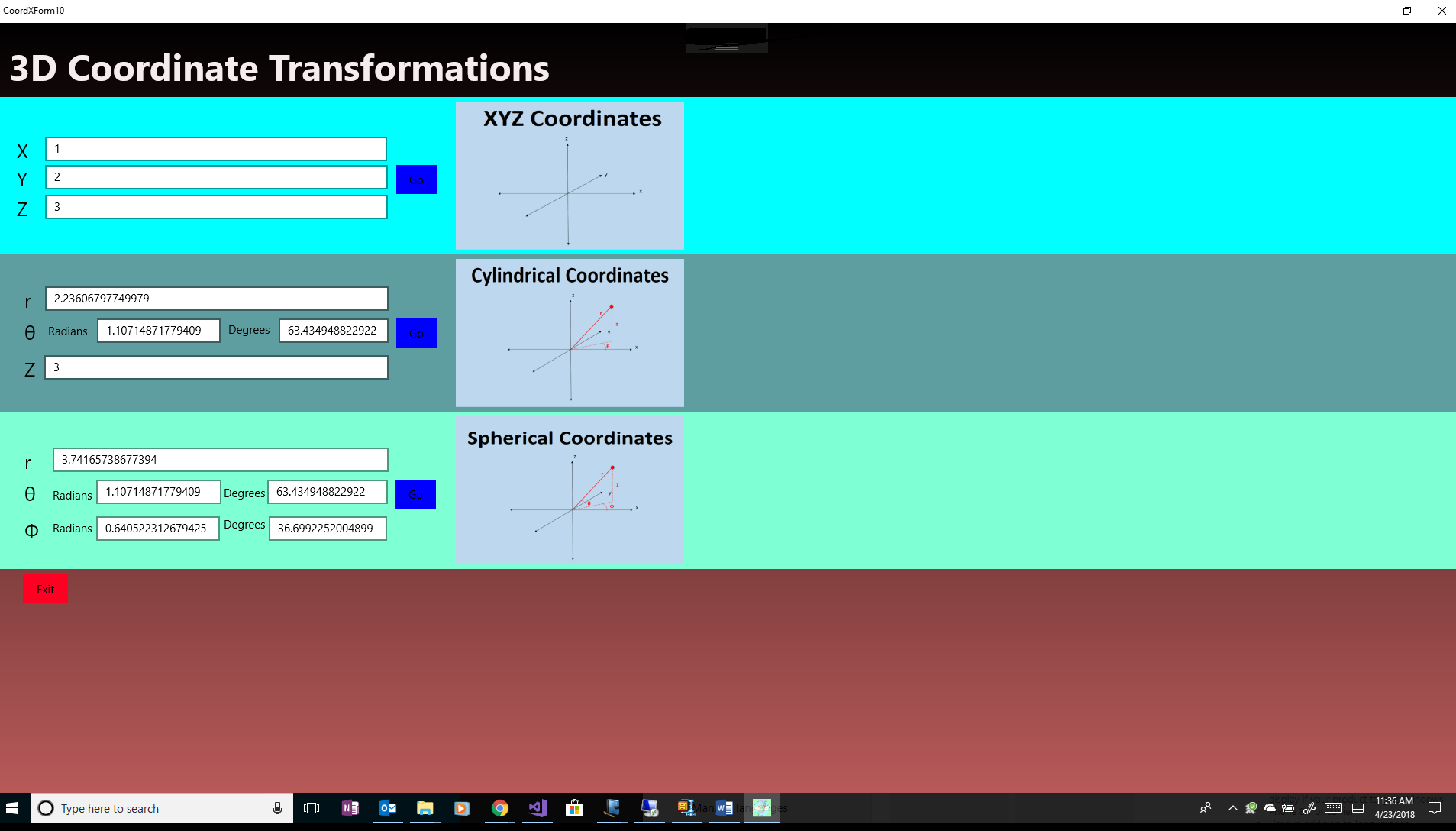 This app translates coordinates to different three dimensional systems: Cartesian, Spherical, and Cylindrical. Input the coordinates in one system, and the coordinates are calculated for each of the other systems.