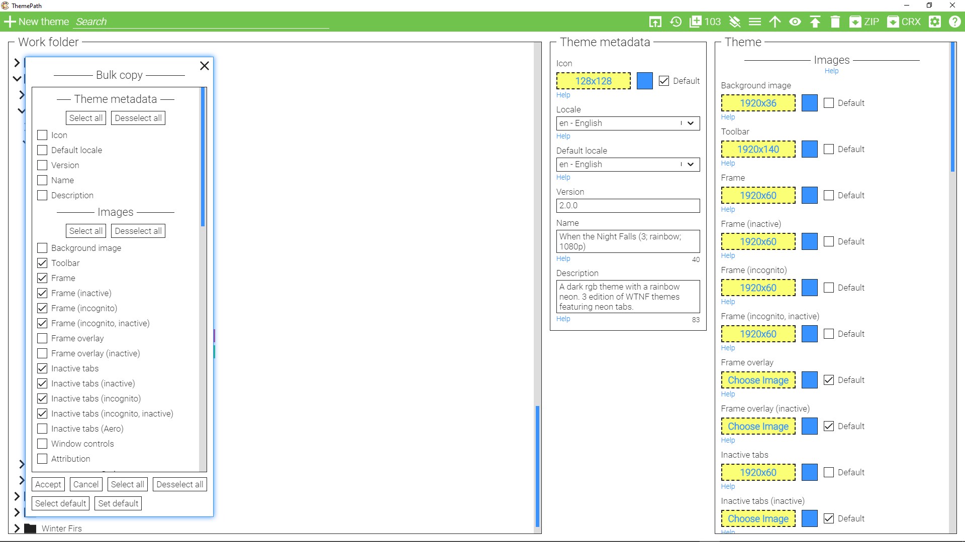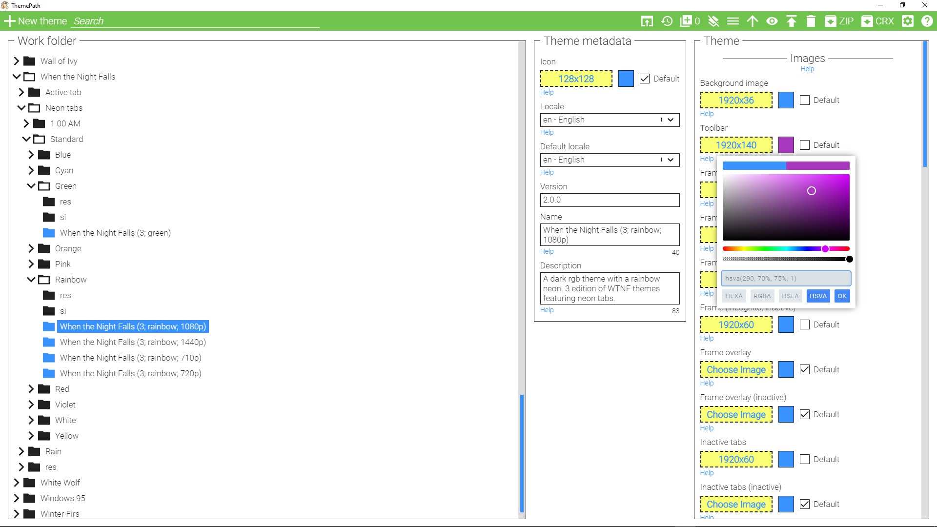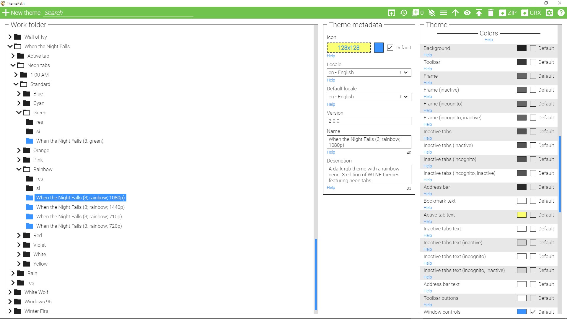 Theme library: all your themes are stored on your machine and displayed within the app as a directory treeFull theme customization capabilities: change any part of your theme that Chromium theme engine allows you to changeTheme preview: open your theme in any Chromium bowser with one click.
