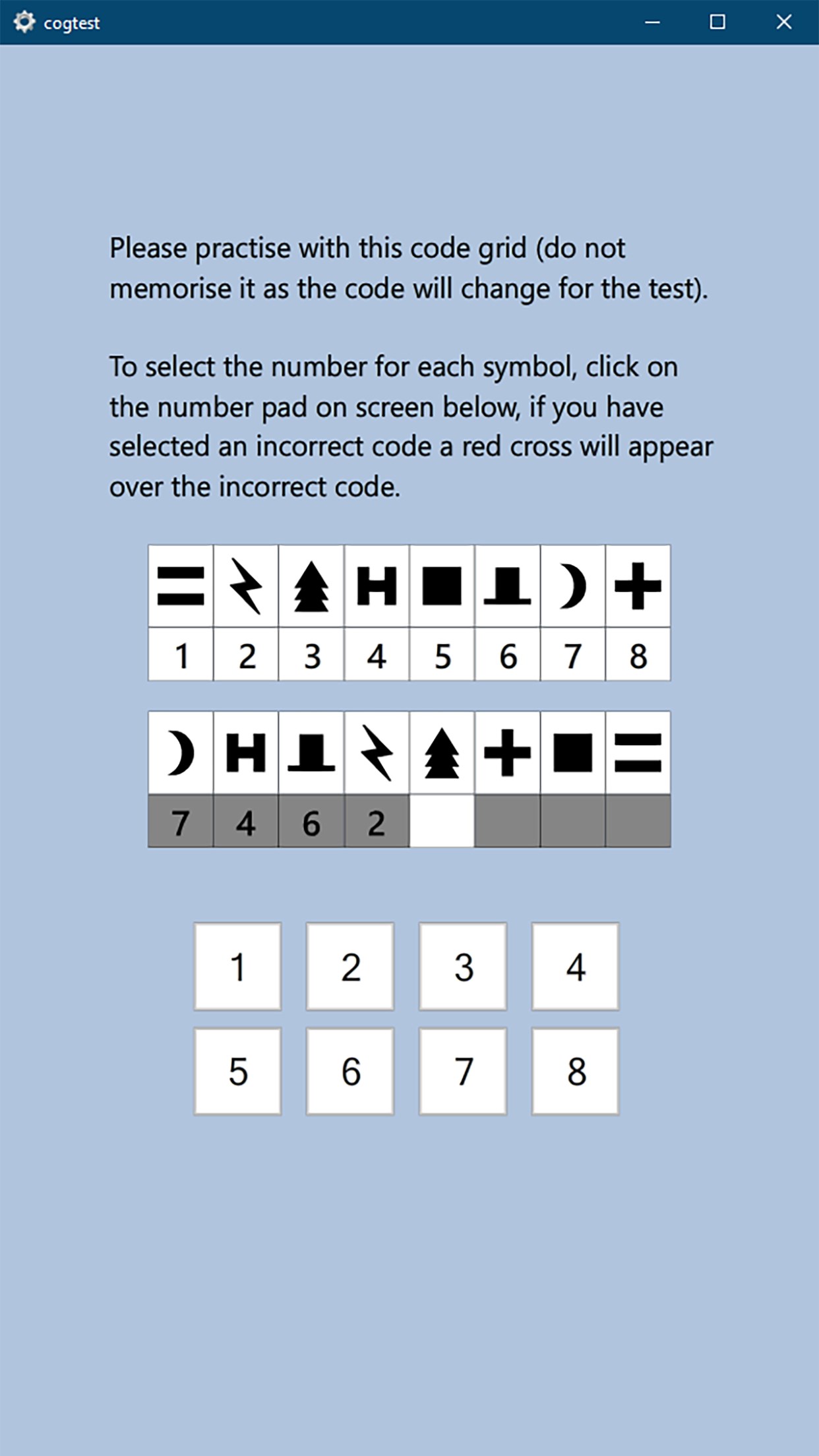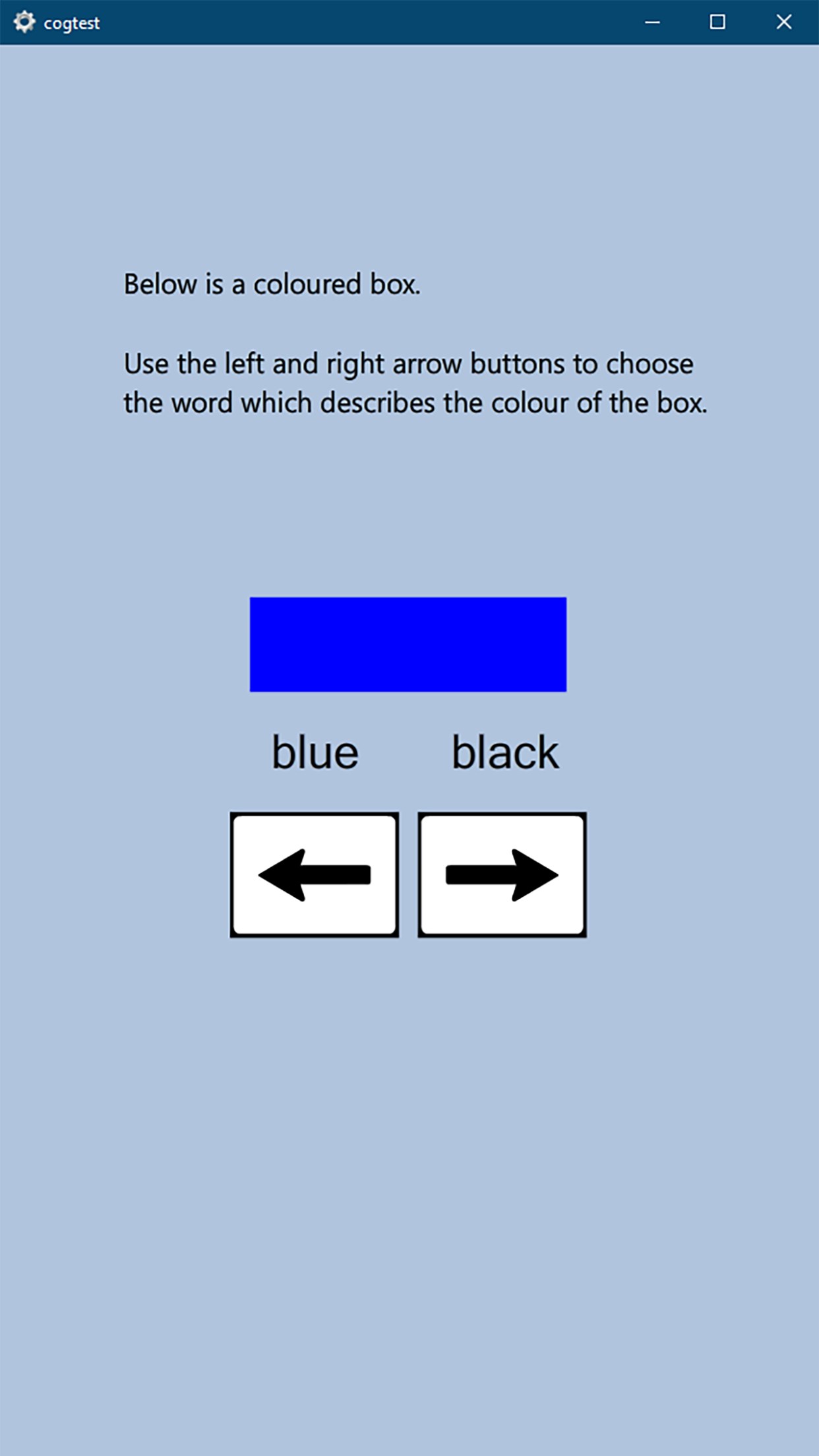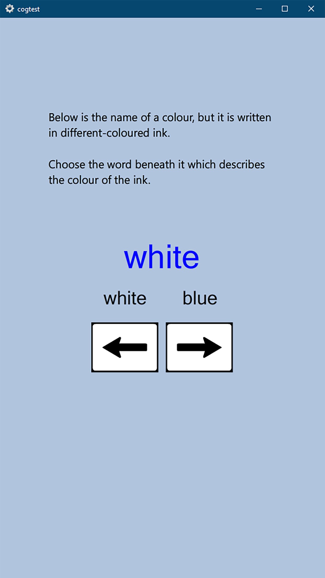 Cognitive testing battery - Reaction test, Quiz, Working Memory, Pairing, Stroop-Box, Stroop-Ink, Matrices, Trails, Vocabulary, Symbols.