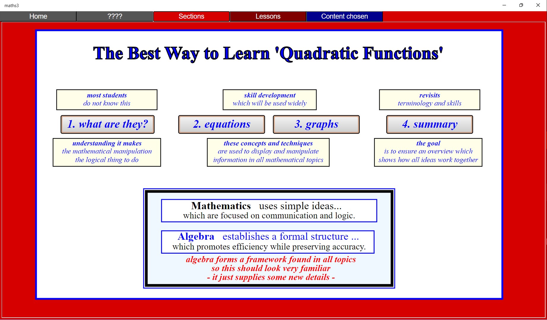 This e-book builds on book 2 and develops the algebra further to cover Quadratic Functions.