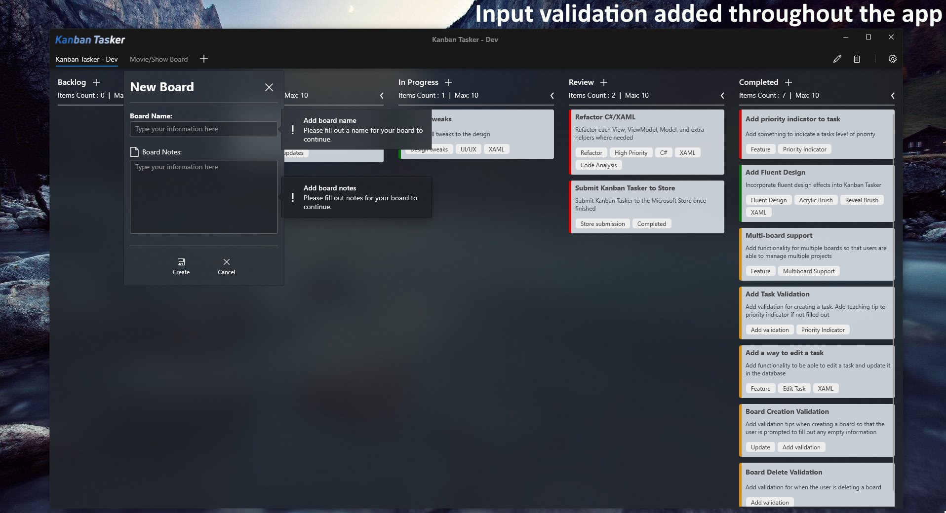 Task drag and dropAbility to edit tasks though a side paneInput validation to avoid interruptionMulti-board supportTask reminder notificationsOptions for task due date, time due, reminder, start date, and finish dateTask CalendarBackup/Restore to the cloud with OneDriveEdit column names on a boardEdit max task limit for each columnAdd/remove columnsDialog to delete one or more boards at a time