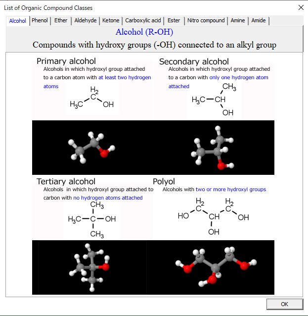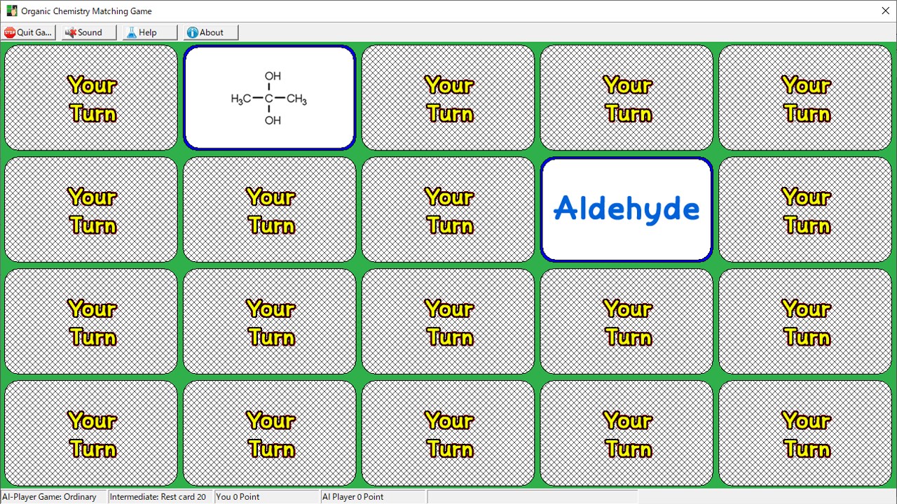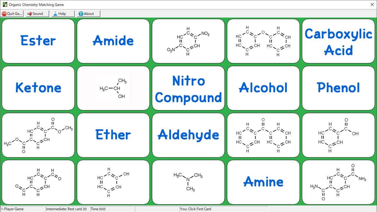 This is an organic chemistry version of the matching game where you select and match cards with classification names (alcohols, phenols, ethers, aldehydes, ketones, carboxylic acids, esters, nitro compounds, amines, amides), two-dimensional, and three-dimensional structures. The rules are the same as in the card matching game.