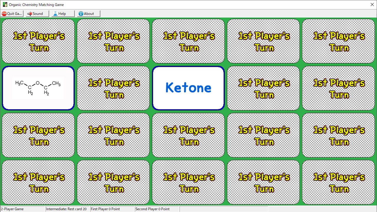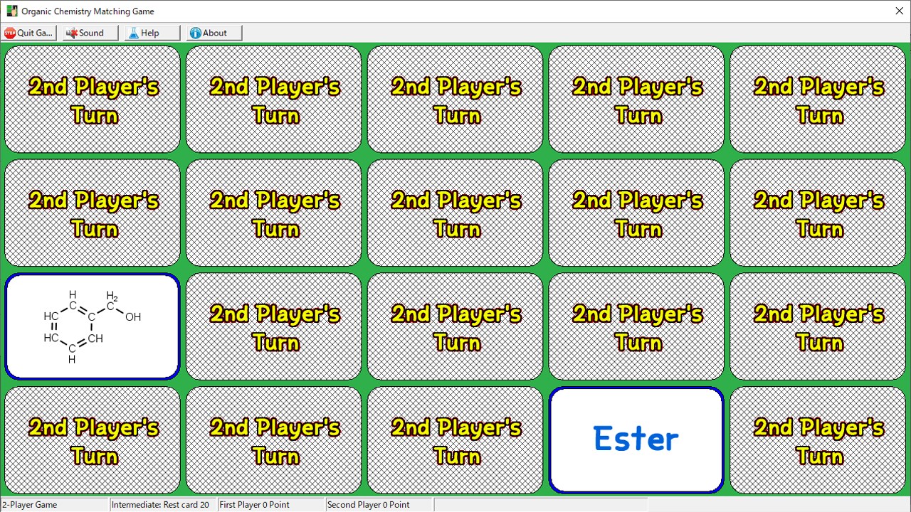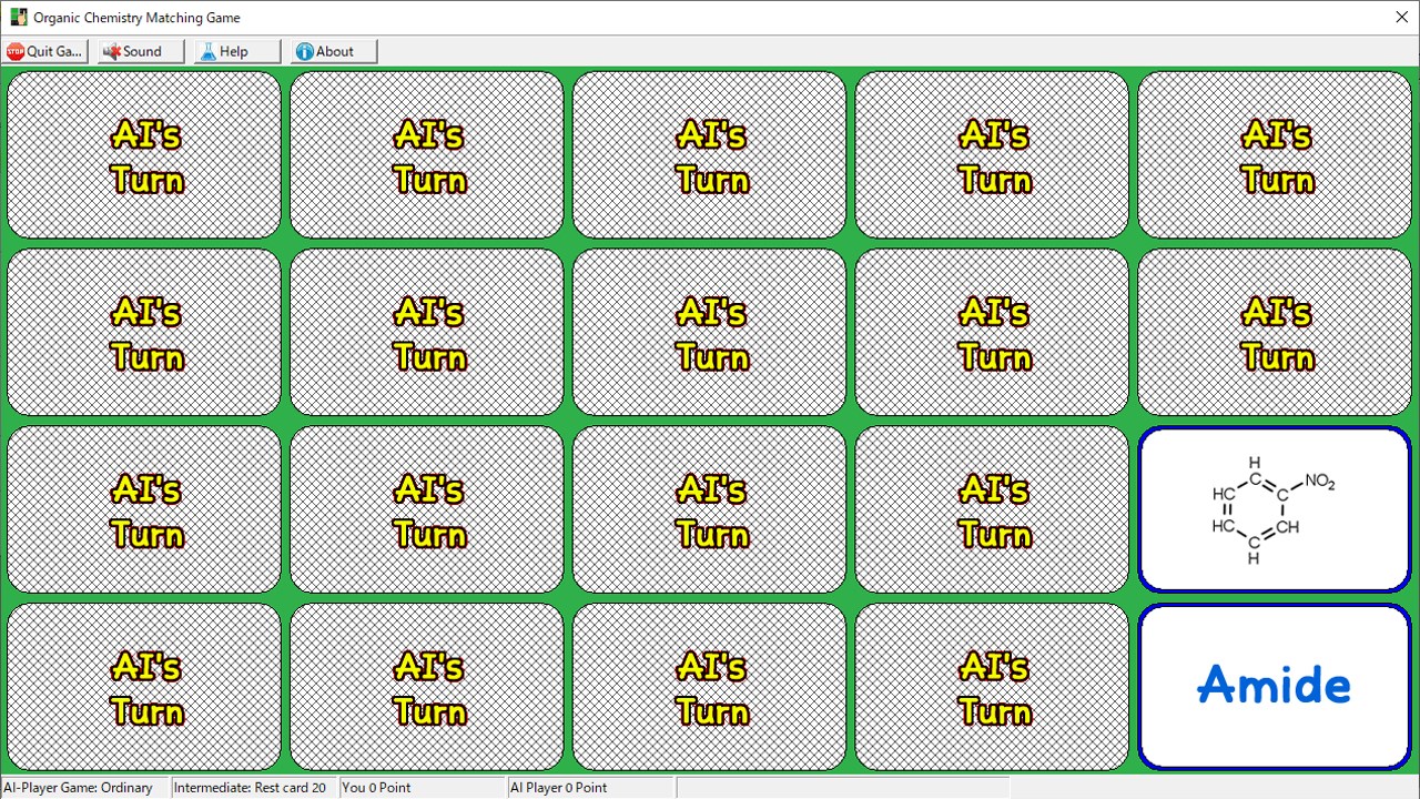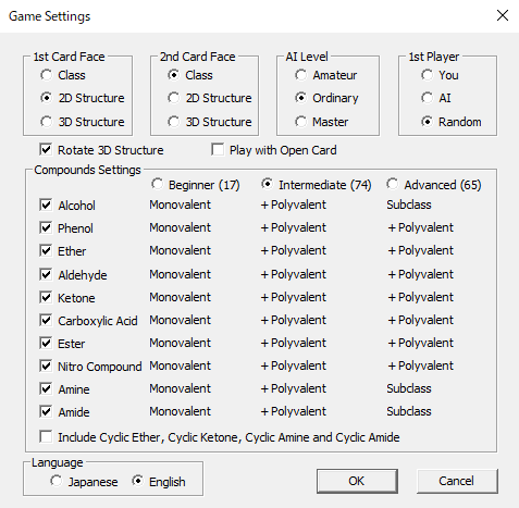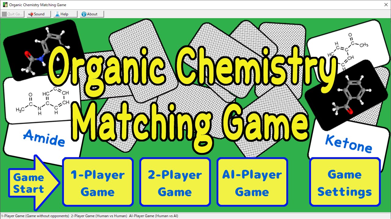 One-player game: Practice mode for learning organic chemistryTwo-player game: A game between two peopleAI-player game: Human vs PC gameCard type: You can choose from two-dimensional, three-dimensional structure, and classification name.Help: You can see a list of functional groups using two-dimensional and three-dimensional structuresPlay with open card: You can play a game with open cards, suiting for learning organic chemistry.