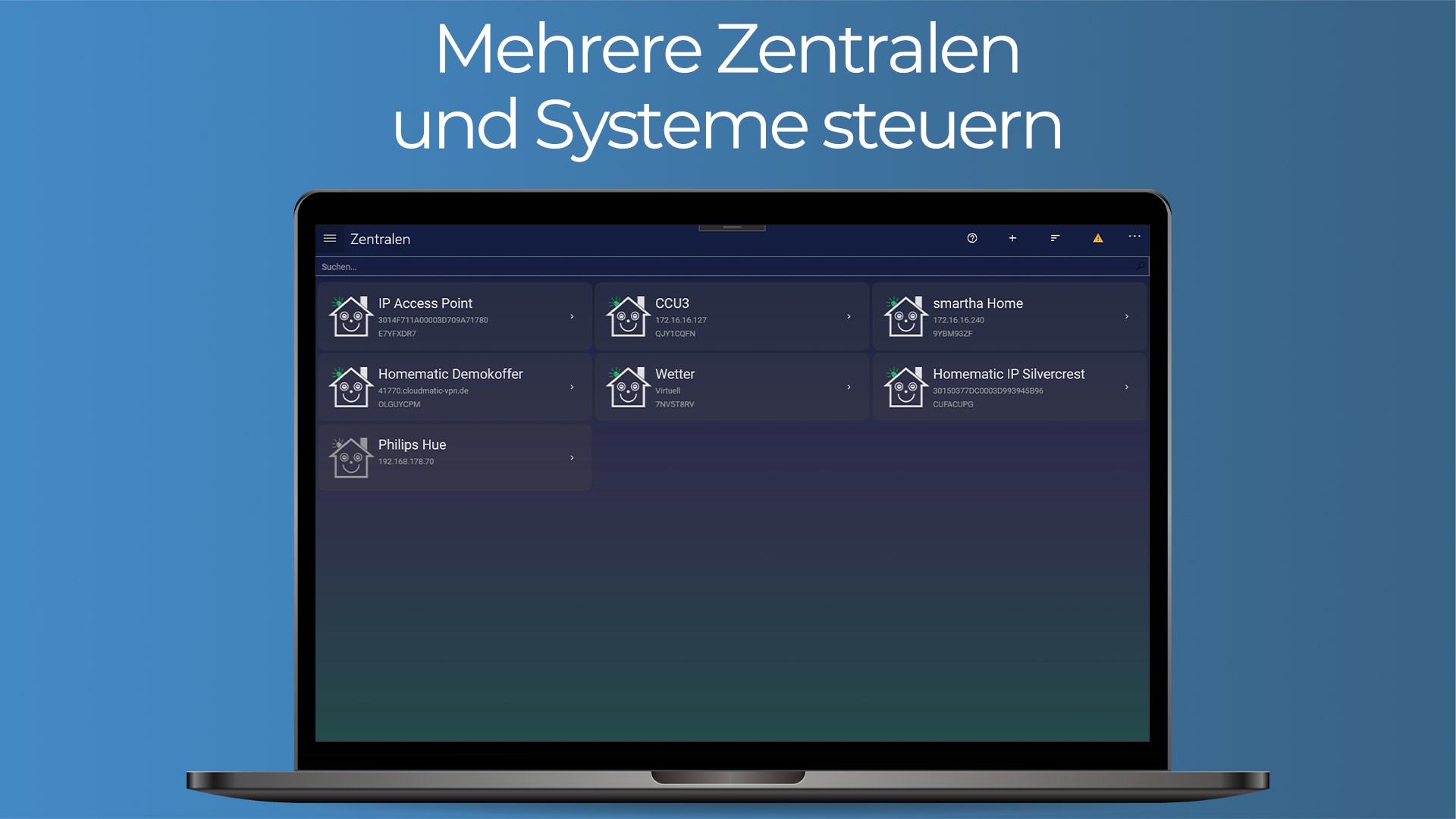 The Smartha App is a cross-platform application developed by EASY SmartHome GmbH with the aim of enabling the uniform control of separately used smart home systems from various manufacturers.
