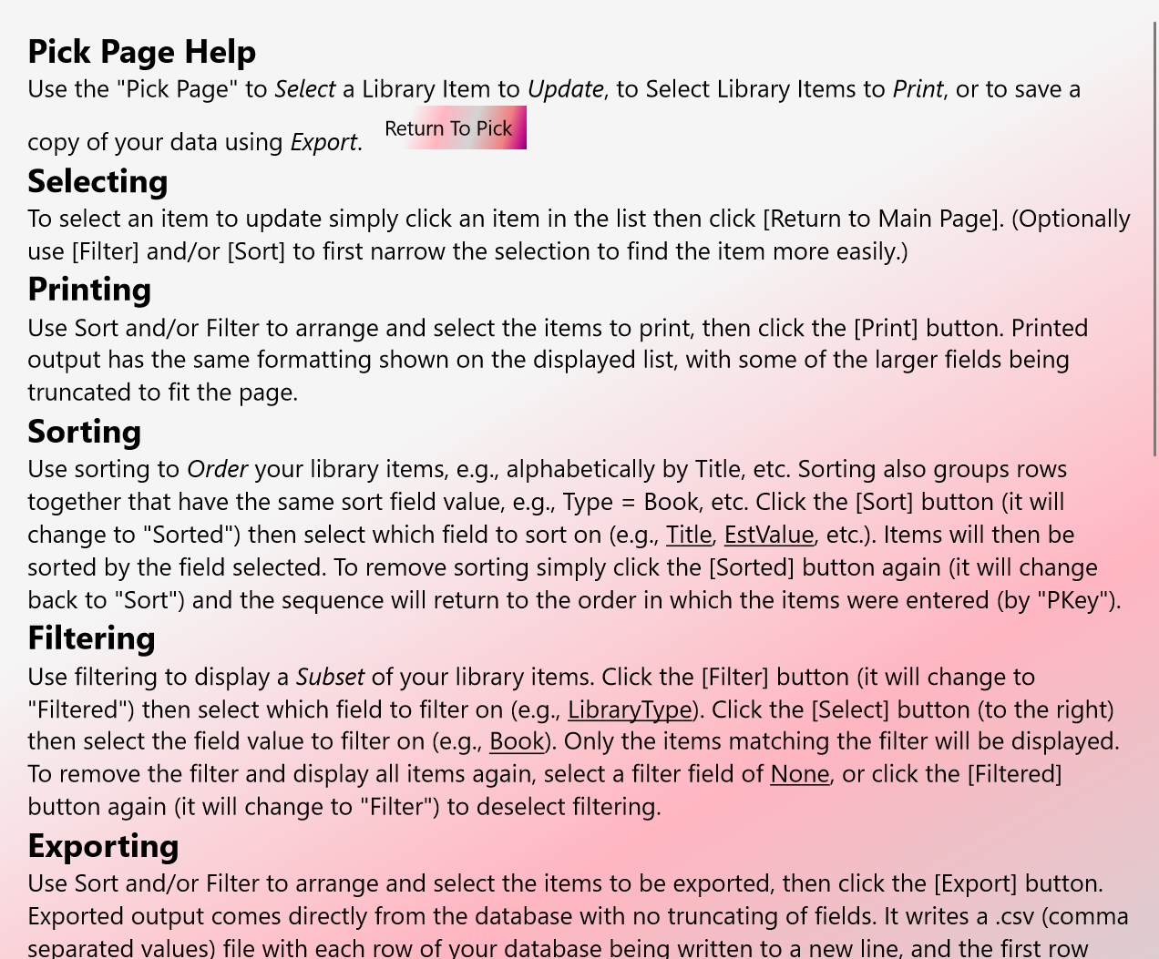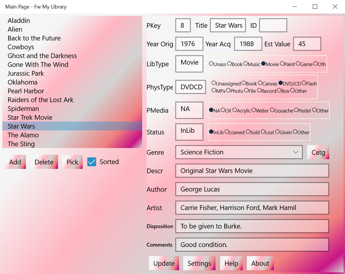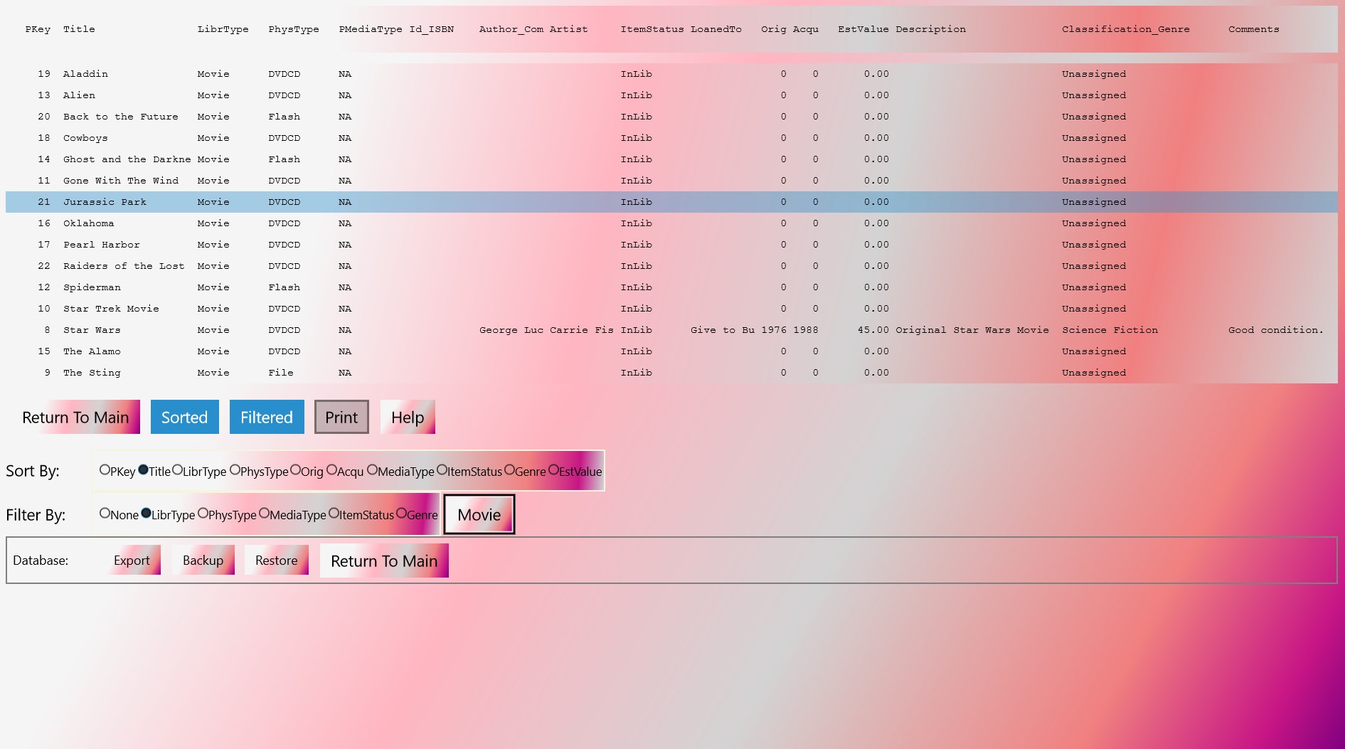 Keep track of your books, movies, music, paintings, games, and other library items by entering them into your own private database. Track title, type, genre, estimated value, acquisition year, disposition, status, etc., for each item entered. Your library can be sorted, filtered, and printed. You can also export your data into a comma separated values (*.csv) file, viewable using most spreadsheet software. Database backup and restore features.