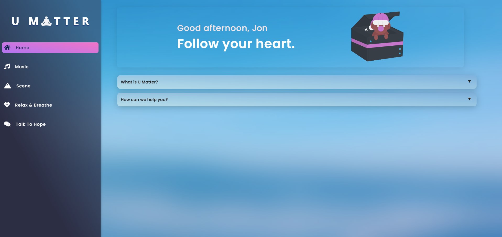 "U Matter" is your go-to relaxation app that caters to your well-being. With soothing rain sounds, guided breathing timers, and breathtaking landscapes, it offers the perfect escape from life's stresses. Whether you need a moment to unwind, meditate, or simply find peace in tranquil environments, "U Matter" provides a sanctuary for your mind and soul. Immerse yourself in a world of serenity and rejuvenation with this app, where you matter the most.