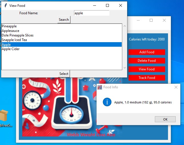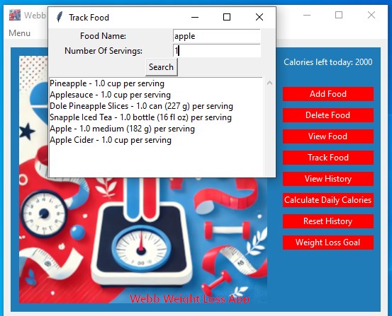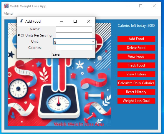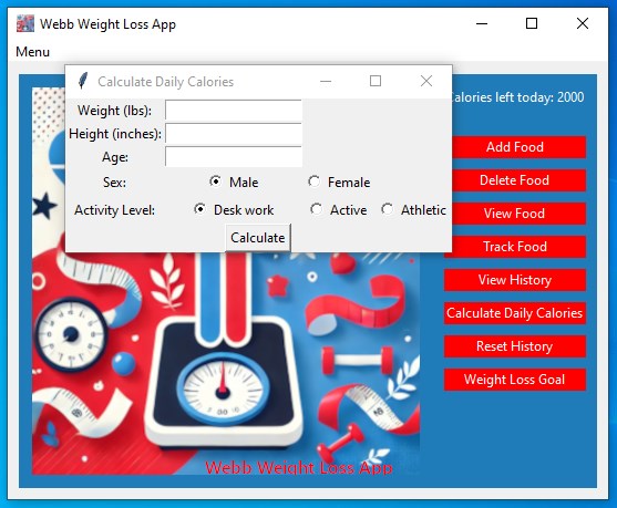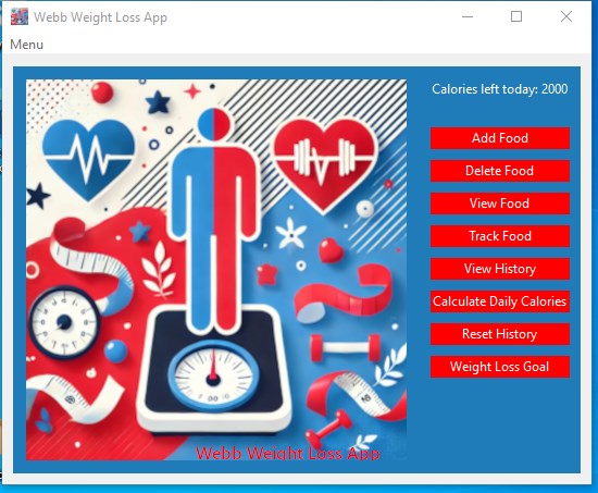 Achieve your weight loss goals with confidence using the Webb Weight loss App! This innovative and user-friendly tool empowers you to manage your calories, track your daily progress, and reach your health milestones—all in one place. Whether you're looking to shed pounds, maintain a healthy lifestyle, or monitor your eating habits, the Webb Weight loss App makes it easier than ever to stay on track. This app determines your daily calorie requirements for weight maintenance, takes in an input for desired monthly weight loss, then helps you track your daily food intake to achieve those goals! We know you can do it, especially with a little help!