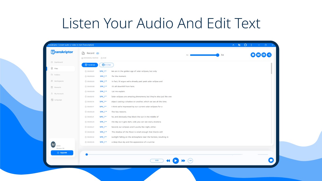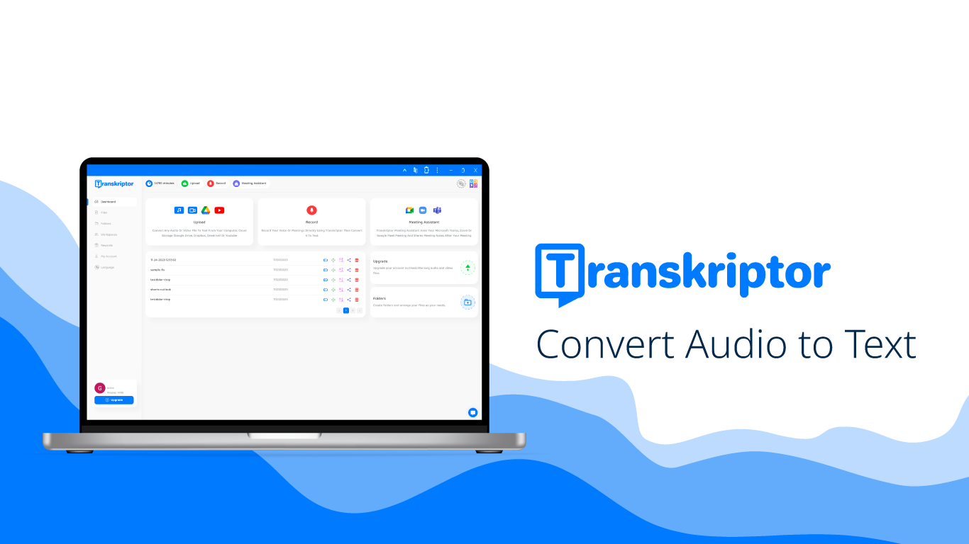 Transkriptor is speech to text app that transcribes meetings, class, audio, and voice to text! Use an automatic transcription app to take meeting notes and dictate interviews. It supports all file formats, so you can easily convert audio and video to text! The speech-to-text app offers 90 minutes of free transcription. So, you can test the accuracy of the audio transcriber.