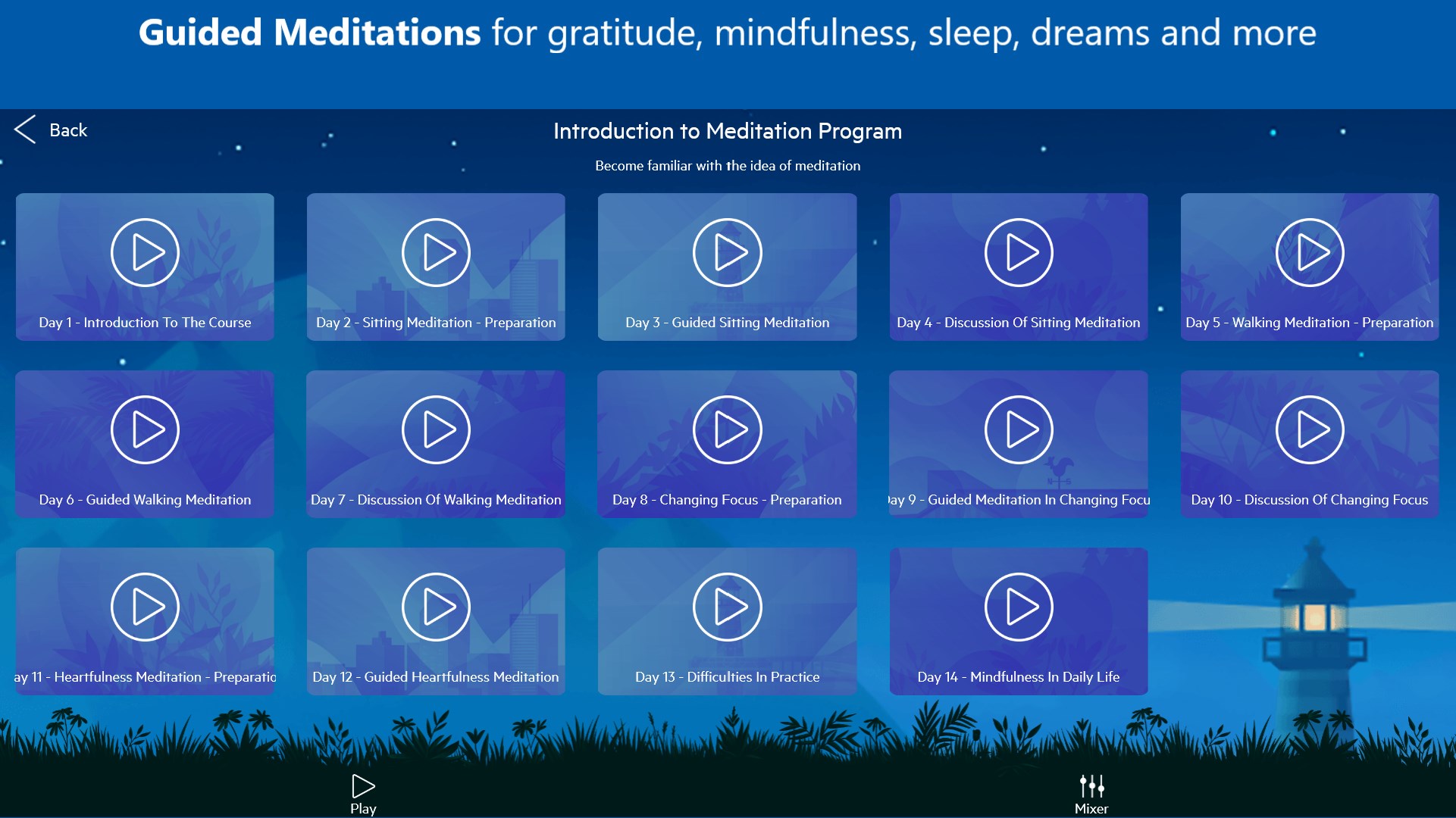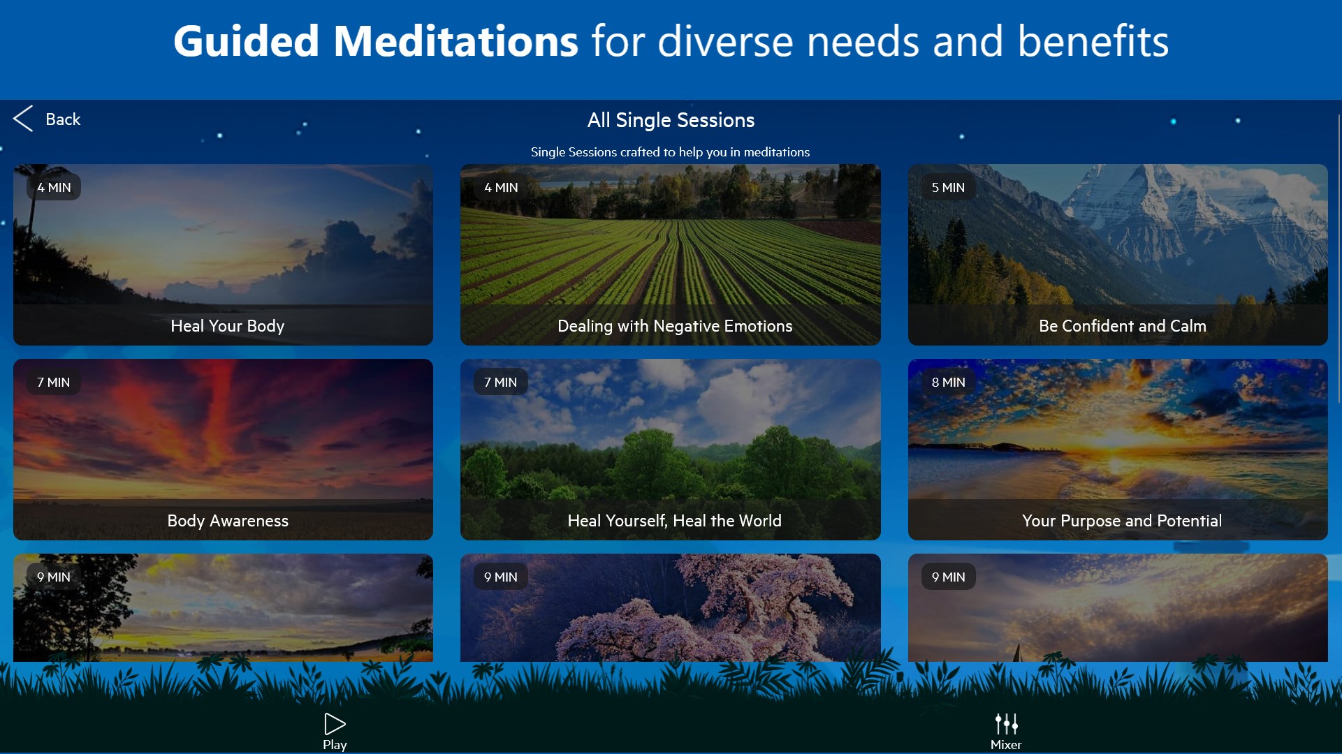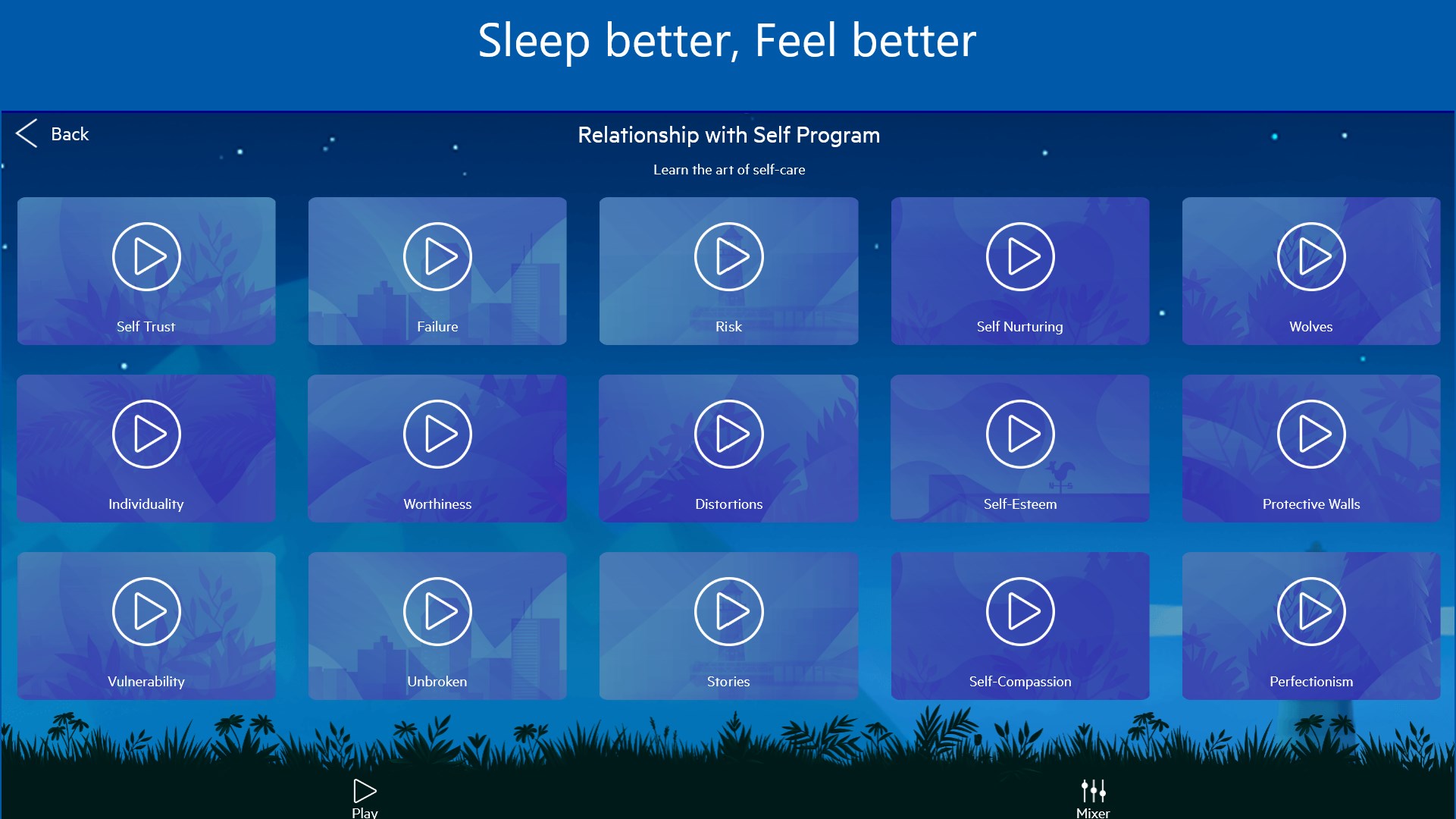 - A wide selection meditation programs on various topics, such as self-esteem, relationships, success, creativity and commuting