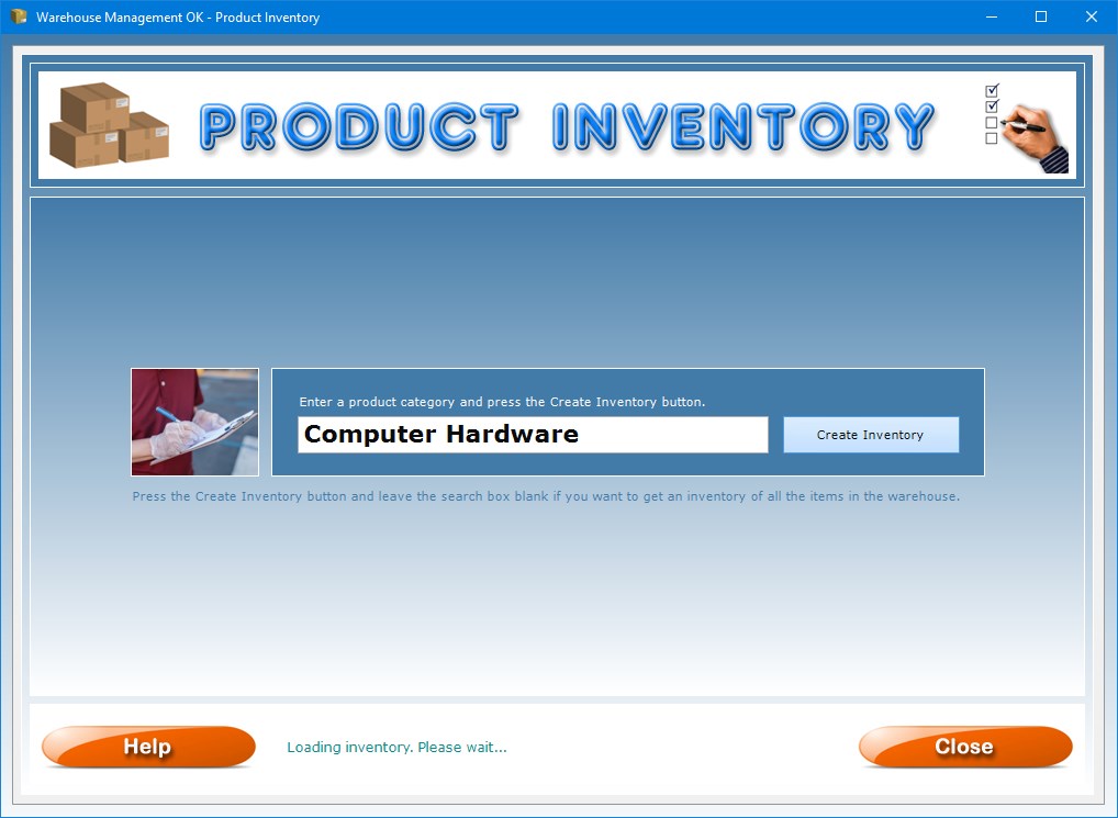The Product Inventory app allows you to view and print the inventory of all the goods in your warehouse or only those belonging to a specific product category. All you have to do is enter a product category in the search box and press the Create Inventory button. To obtain an inventory of all of the items in stock, you must press the Create Inventory button without specifying any product category.