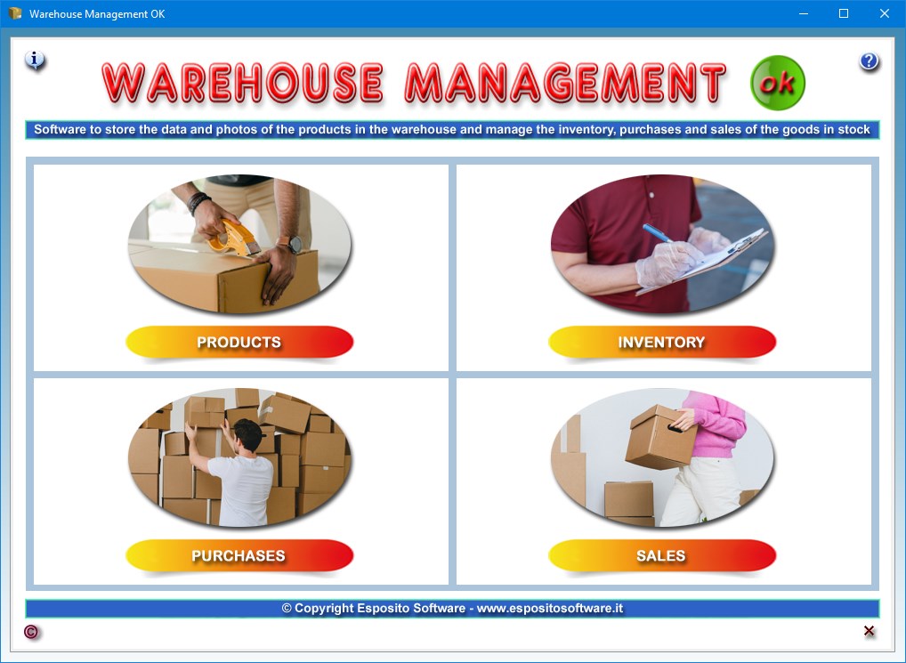 In conclusion, Warehouse Management OK is the ideal tool for those who want to quickly and professionally manage the stock of goods available, running out or unpaid for, record every purchase and sale transaction, and obtain with a few clicks the partial and total inventory of the products in order to monitor the availability of every single item on sale. The user will be pleasantly surprised to see how the software requires practically no learning time.