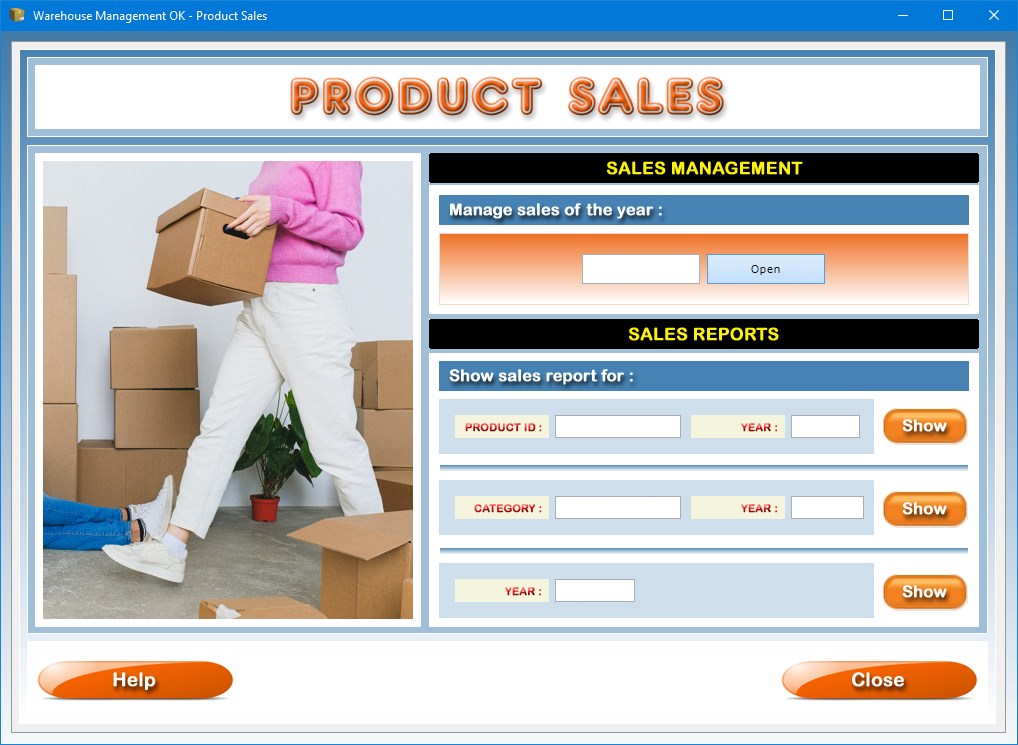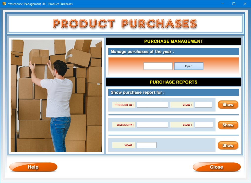 The software allows you to get reports on all the purchase or sale operations that have been stored in the annual databases. You can use the product ID or the product category as search keys, or you can get a report on all purchase or sale operations recorded in the selected year. To get a report, all you have to do is enter either a product ID or a product category in the appropriate search box, select the year of your interest and press the Show button. For an annual report, just select the year and press Show.