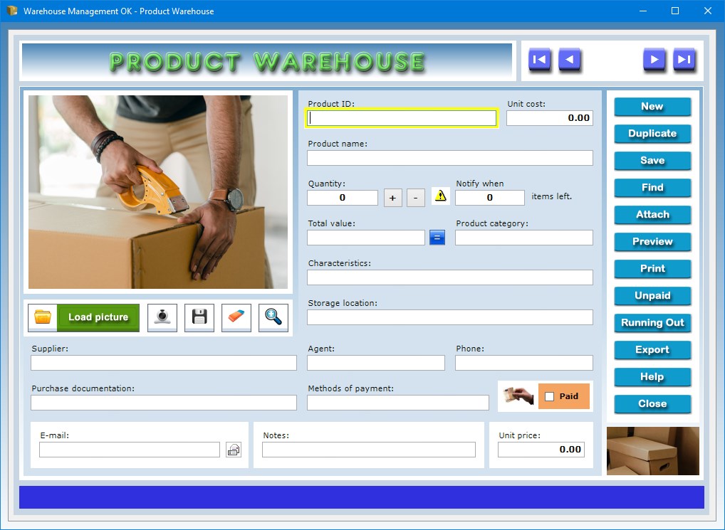 Warehouse Management OK is very user-friendly software designed to catalog goods, commodities, merchandise and anything else marketed by your company, view a summary of all products running out and those awaiting payment, obtain a partial or total inventory of the goods in stock including their total value, record the details of each purchase and sale transaction, export the entire database of items to Microsoft Excel. This app also allows you to insert in each record a photo of the product captured with your webcam or loaded from your hard disk. When you register a purchase or sale operation, you have the opportunity to automatically update the quantity of the product in the warehouse.