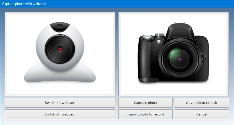 To insert a photo of the product, you can capture the image with your own webcam, which can be activated via the Capture photo button. If you prefer, instead of photographing the product with a webcam, you can take a picture of it in Jpeg format with a digital camera and import it into the record using the Load picture button.