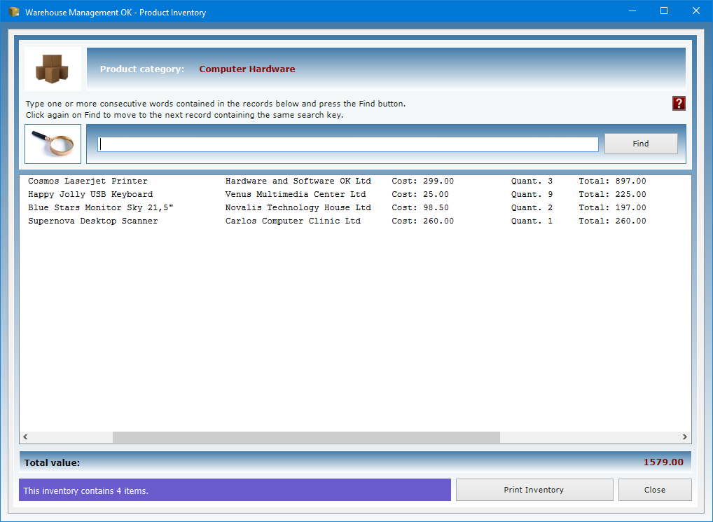 The inventory window shows the list of items in stock, indicating for each of them the product ID, the name of the product, the supplier company, the unit cost, the quantity and the value obtained by multiplying the unit cost by the quantity. At the bottom of the list, the overall total value of the products in the search results is shown, which is obtained by adding the individual values of all the items listed.