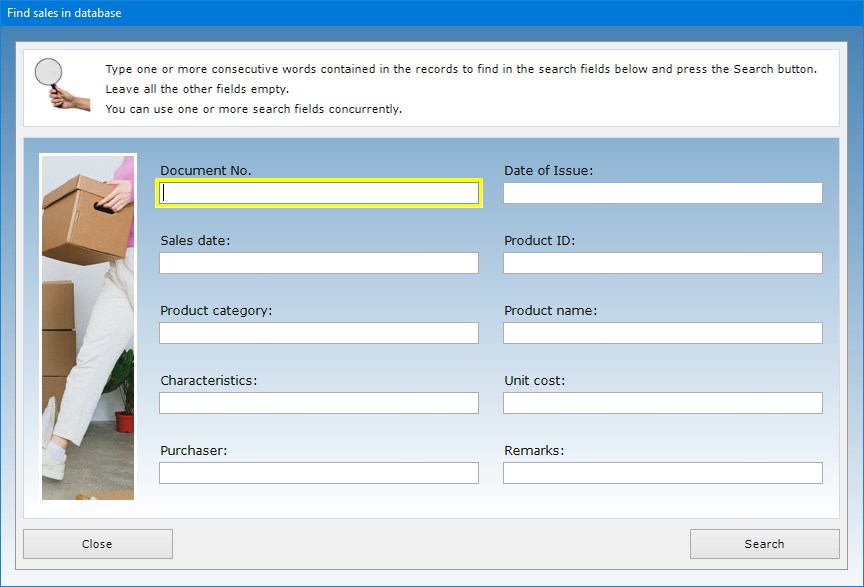 You can carry out advanced searches in the database. For example, you can obtain a summary of all the goods purchased from a particular supplier or sold to the same customer in the selected year or of all the materials with specific characteristics or belonging to a certain product category. Search results can be printed on paper.