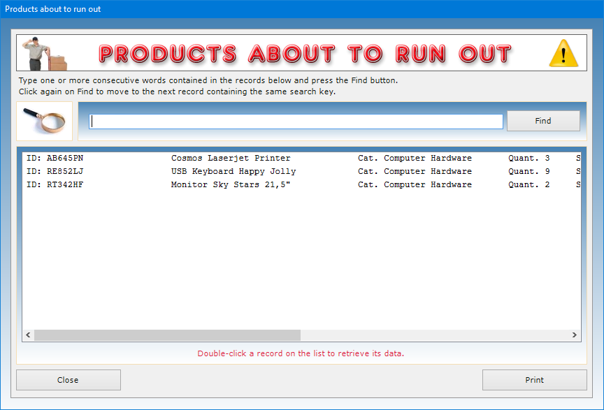 If you want to be notified when the quantity of a product in stock becomes less than the minimum number indicated, you must enter this number in the appropriate box. To view the list of all the products that are about to run out, just click on the Running Out button.