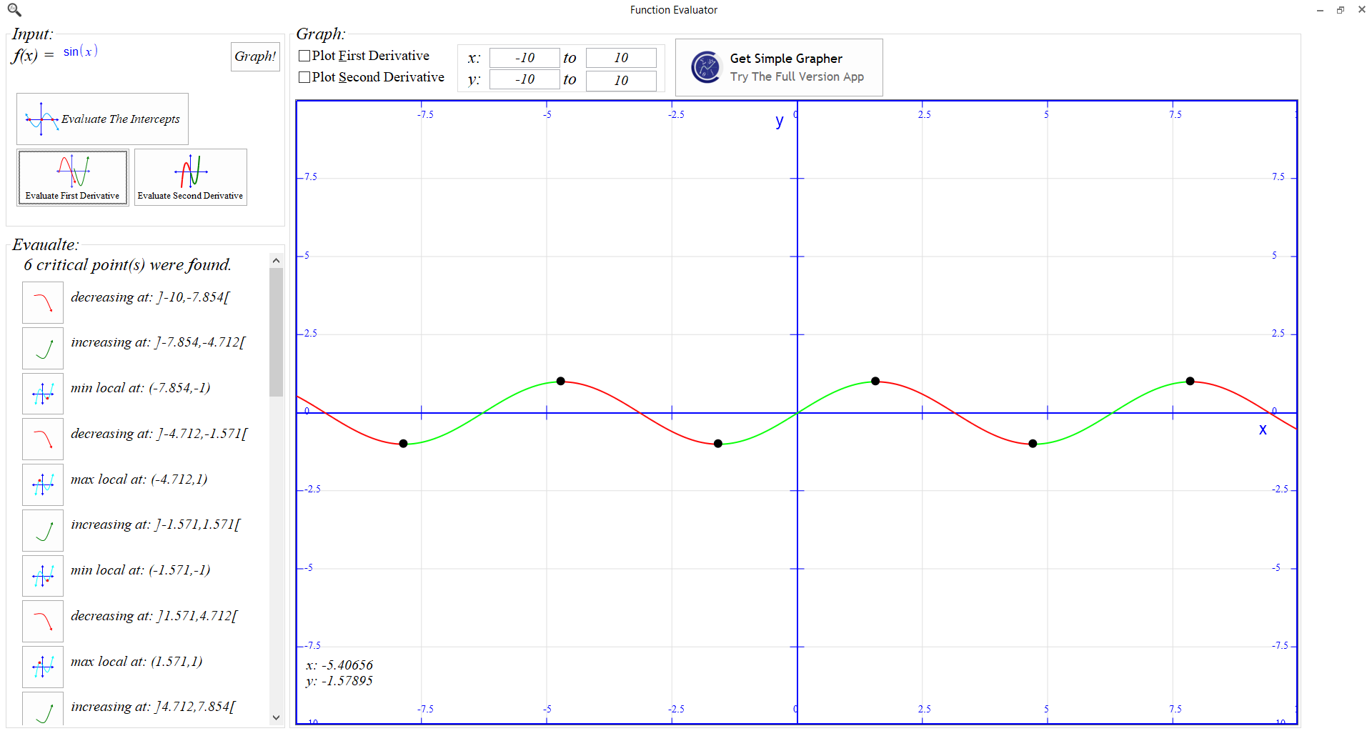 The app can find x and y intercept point of the function. Evaluate first derivative to find increase, decrease range and critical points. Evaluate second derivative of the function to find concave, convex area and inflection points.