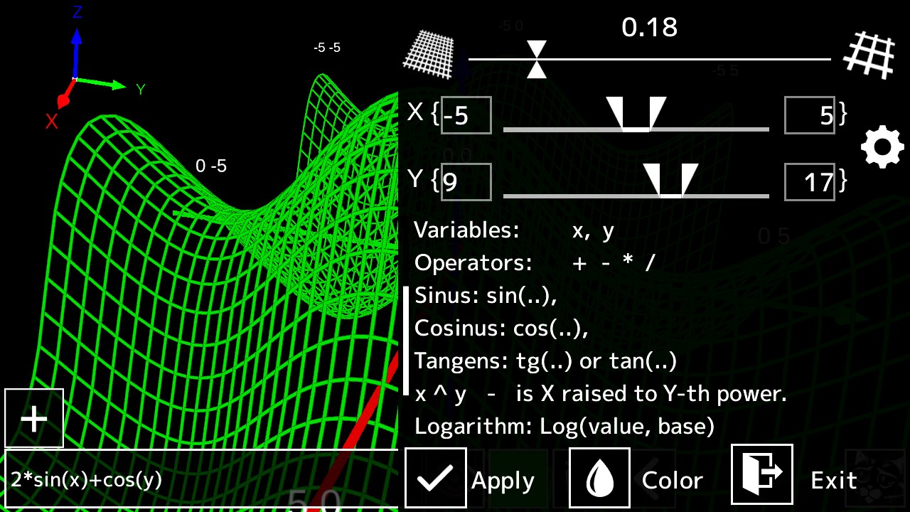 A simple app that draws 3D graphs. With the help of the application, you can create fully customizable 3D graphics of mathematical functions, specifying the accuracy and boundaries of the construction. Many functions are supported, including trigonometric functions, root, logarithm.
