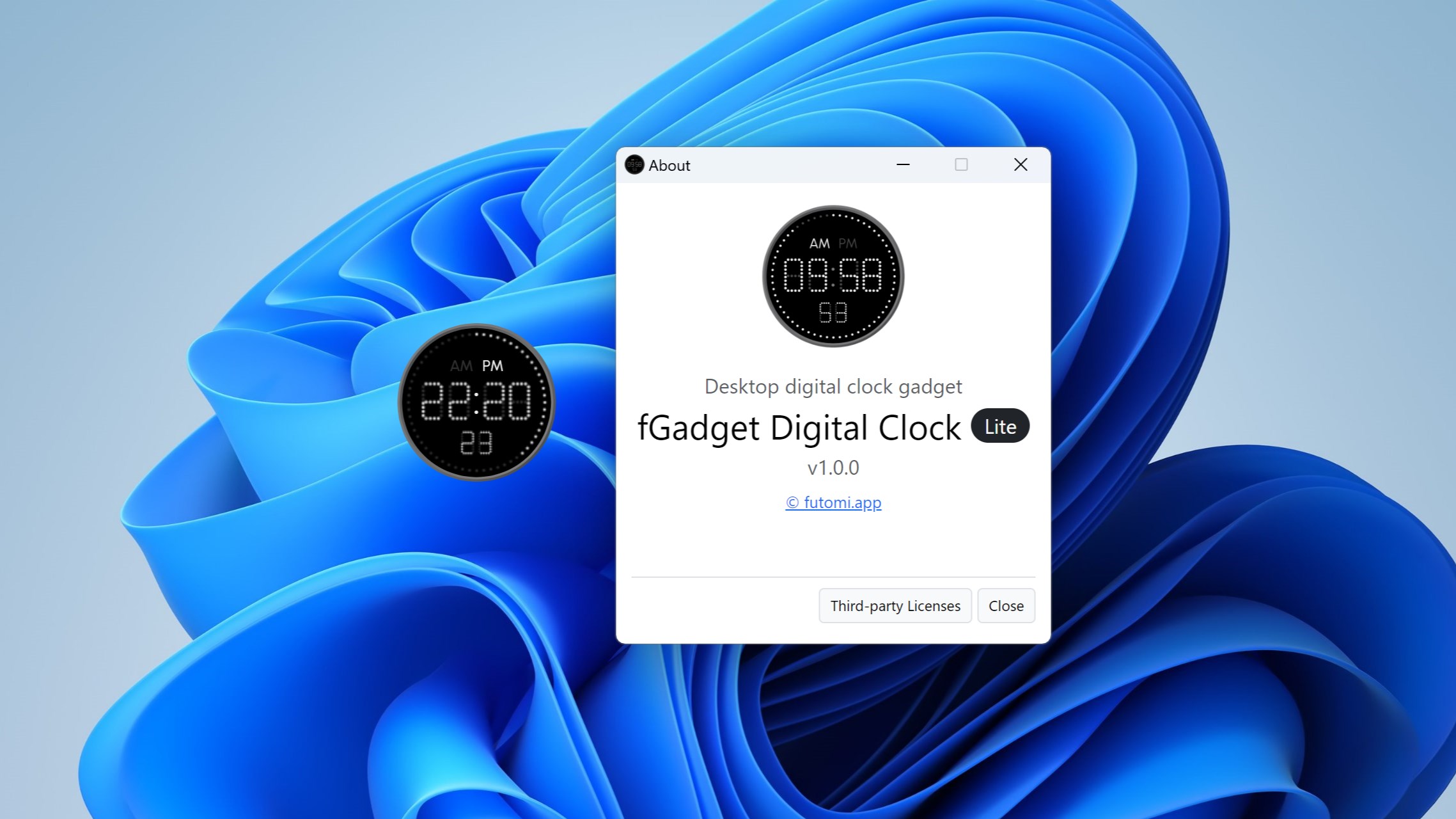 The "fGadget Digital Clock Lite" is a simple desktop digital clock gadget. You can freely move the app on your desktop dragging the app using your mouse. The app allows you to select your favorite face style, to change transparency, and to show/hide the second indicator.