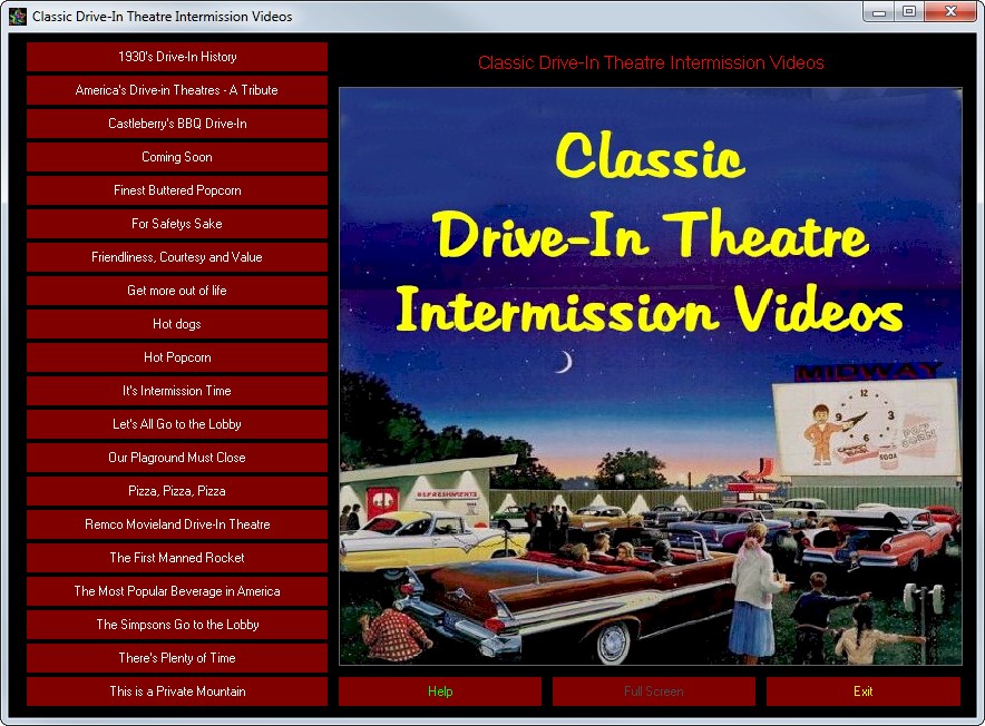 Classic Drive-In Theatre Intermission Videos is a collection of 20 videos totaling nearly 40 minute. This collection of nostalgic footage will remind you of the golden age of drive-ins and cars. These intermission commercials were simple, informative and funny. They featured hot dogs, hamburgers, pizza, coffee and more.